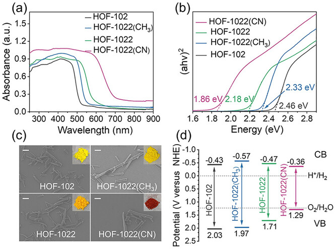 2) 四种HOFs的光学带隙分别为HOF-102(2.46 eV)、HOF-1022(CH₃)(2.33 eV)、HOF-1022(2.18 eV)、HOF-1022(CN)(1.86 eV)