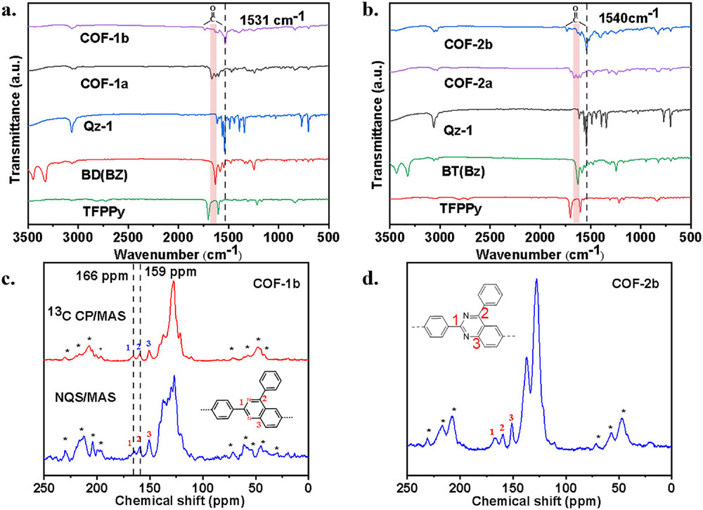 FT-IR 显示 COF-1b/2b 分别在 1531、1540 cm⁻¹ 出现喹唑啉特征峰,羰基峰消失;固体 ¹³C-NMR 与 XPS 证实喹唑啉环成功构建,无残留亚胺信号。