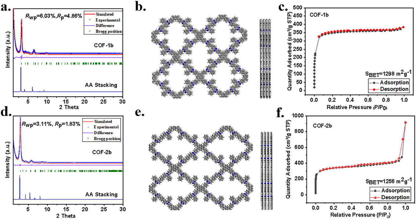 PXRD 证实二者为 AA 堆积,COF-1b 晶胞参数 a=46.783 Å、b=36.198 Å、c=3.434 Å,COF-2b 为 a=42.127 Å、b=53.103 Å、c=3.435 Å;77 K 氮气吸脱附显示,COF-1b BET 比表面积 1298 m²・g⁻¹、孔容 0.59 cm³・g⁻¹,COF-2b 为 1256 m²・g⁻¹、孔容 1.40 cm³・g⁻¹,均为棒状多孔形貌。