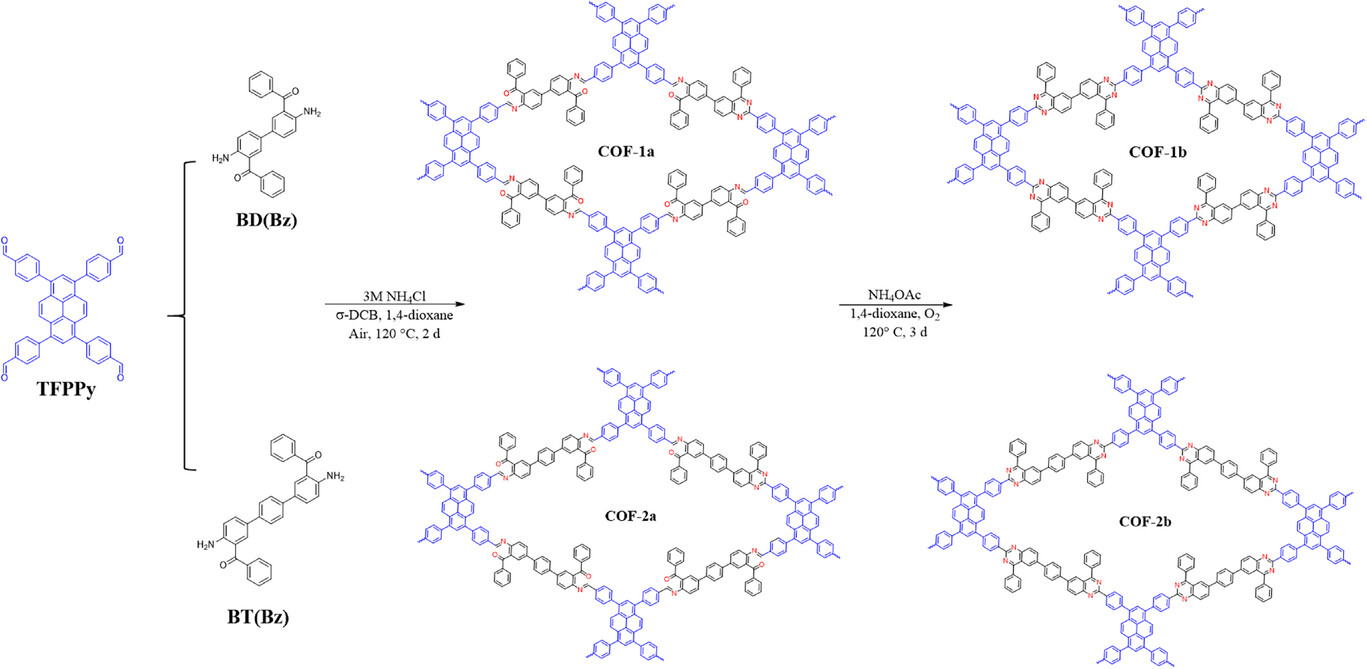 1. 开发两步合成策略,以 TFPPy 为芘基供体,BD (Bz)、BT (Bz) 为芳胺受体,通过氨源调控实现喹唑啉键连 COF-1b 与 COF-2b 的可控制备,材料兼具高结晶度、永久多孔性与优异的酸碱、热溶剂稳定性。