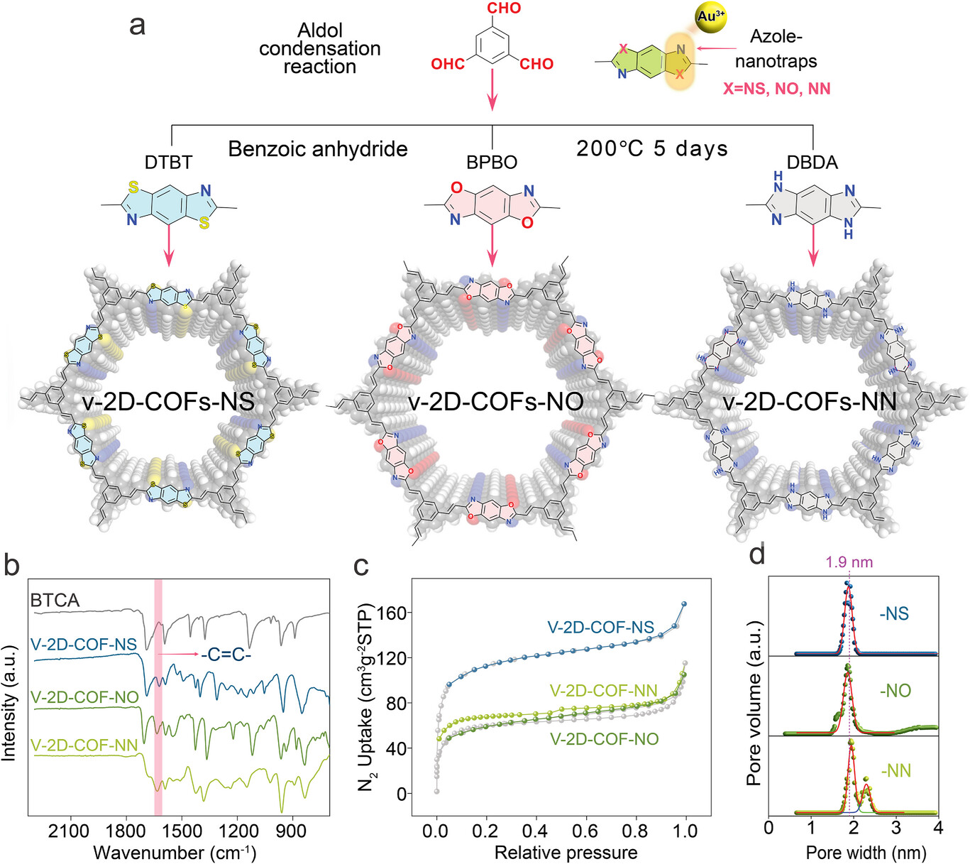 以 1,3,5 - 苯三甲醛(BTCA)为共同单体,分别与含 N/S、N/O、N/N 的唑基单体(DTBT/BPBO/DBDA)反应,邻苯二甲酸酐为催化剂,200℃加热 5 天经羟醛缩聚合成 v-2D-COF-NS/NO/NN,产物结构相似、孔径一致,COF-NS 结晶度最高,COF-NN 结晶度有限但不影响金吸附性能。