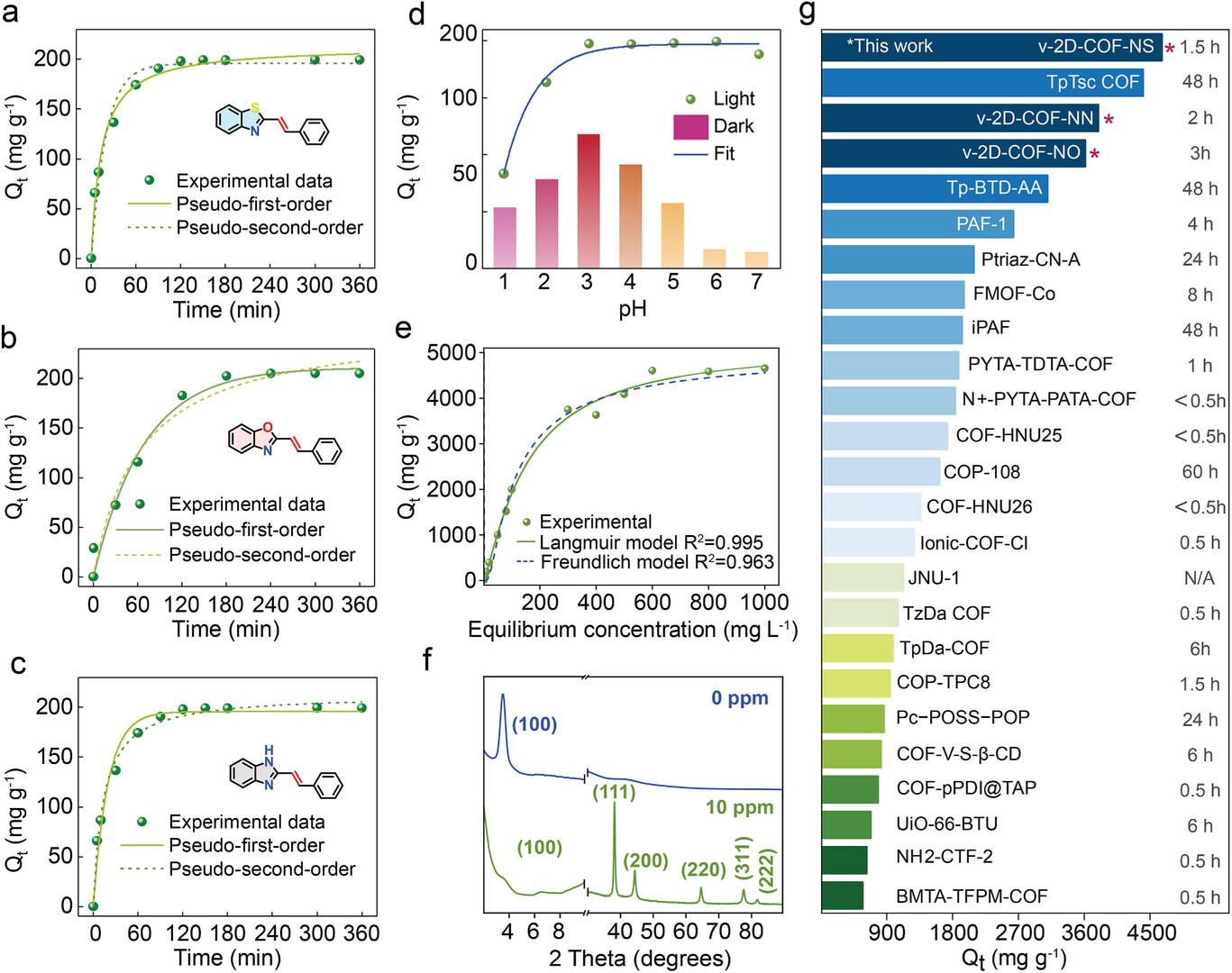 5 mg COF 与 100 mL 10 ppm Au (III) 溶液反应 180 min,COF-NS 在 pH=3 时吸附性能最优,COF-NO、COF-NN 最优 pH 分别为 5-6、2,可见光下吸附容量显著高于黑暗条件。1-1000 ppm Au (III) 溶液吸附等温线显示,COF-NS 最大吸附容量 4658.1 mg・g⁻¹,COF-NN、COF-NO 分别为 3789.8、3610.6 mg・g⁻¹,数据符合 Langmuir 模型,为单分子层吸附。