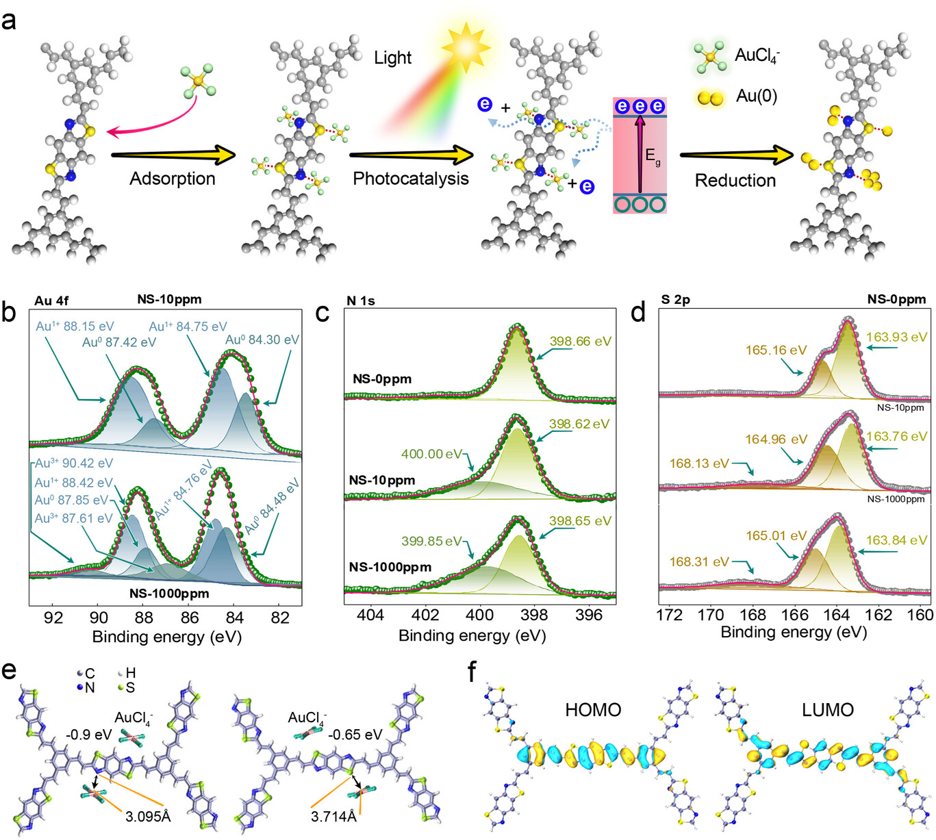 XPS 显示吸附后金出现 Au 4f 特征峰,低浓度下 Au 以 Au (0)、Au (1+) 为主,高浓度下出现 Au (3+);N 1s、S 2p 峰偏移并出现金属配位峰,证实 N、S 为活性位点。DFT 计算显示,COF-NS 中 N 与 Au 结合能 - 2.07 eV(键长 2.45 Å),S 与 Au 结合能 - 0.65 eV(键长 3.71 Å),N 的结合作用更强;ESP 图谱与前线分子轨道分布证实杂原子为电子极化中心与光催化电子转移核心区域。