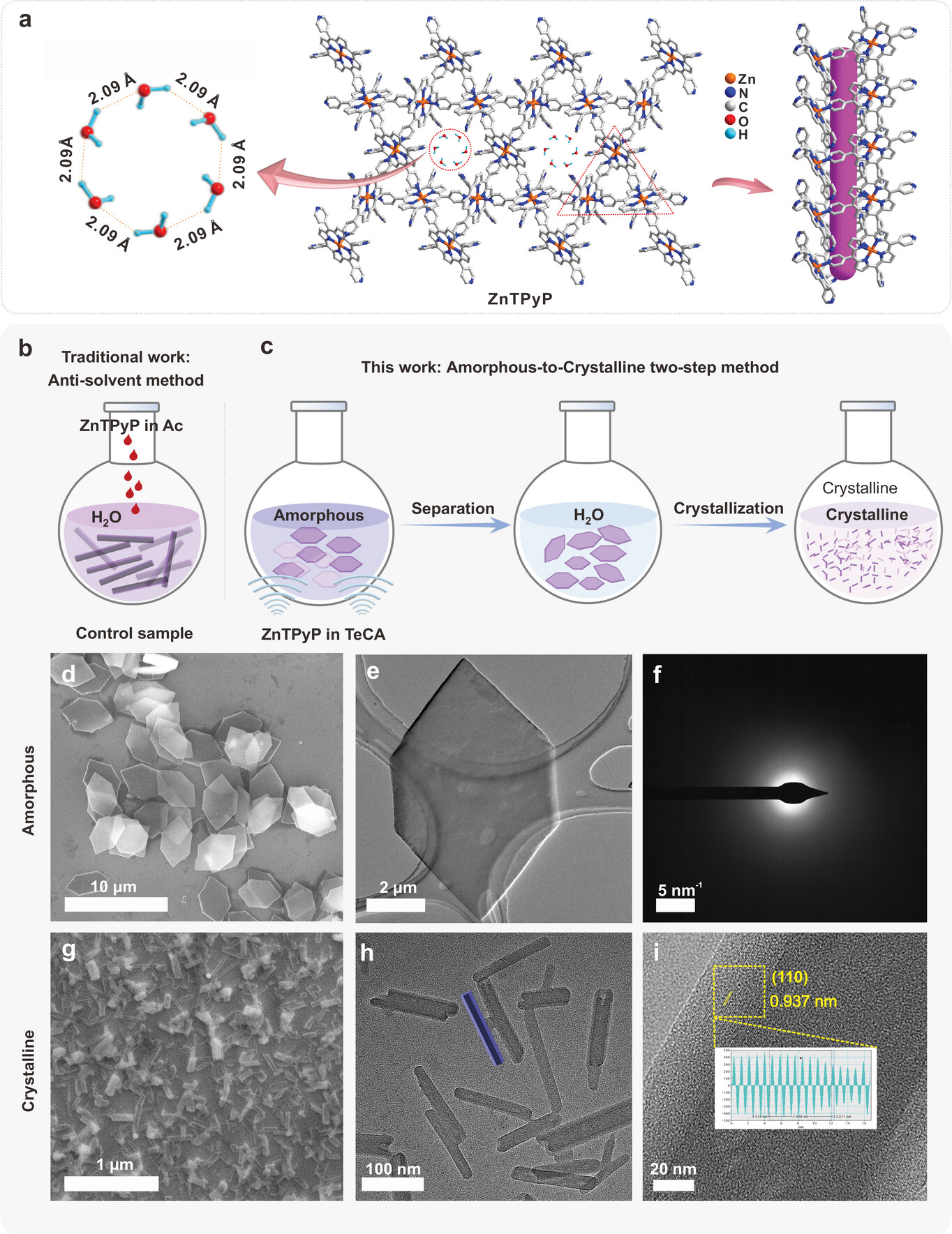 1. 转变机理:ZnTPyP组装成三维蜂窝晶格,无定形前驱体中TeCA遇水排出致结构不稳定,环状六聚水簇与吡啶基形成强氢键(键长2.09 Å),驱动其结晶并维持晶格稳定。