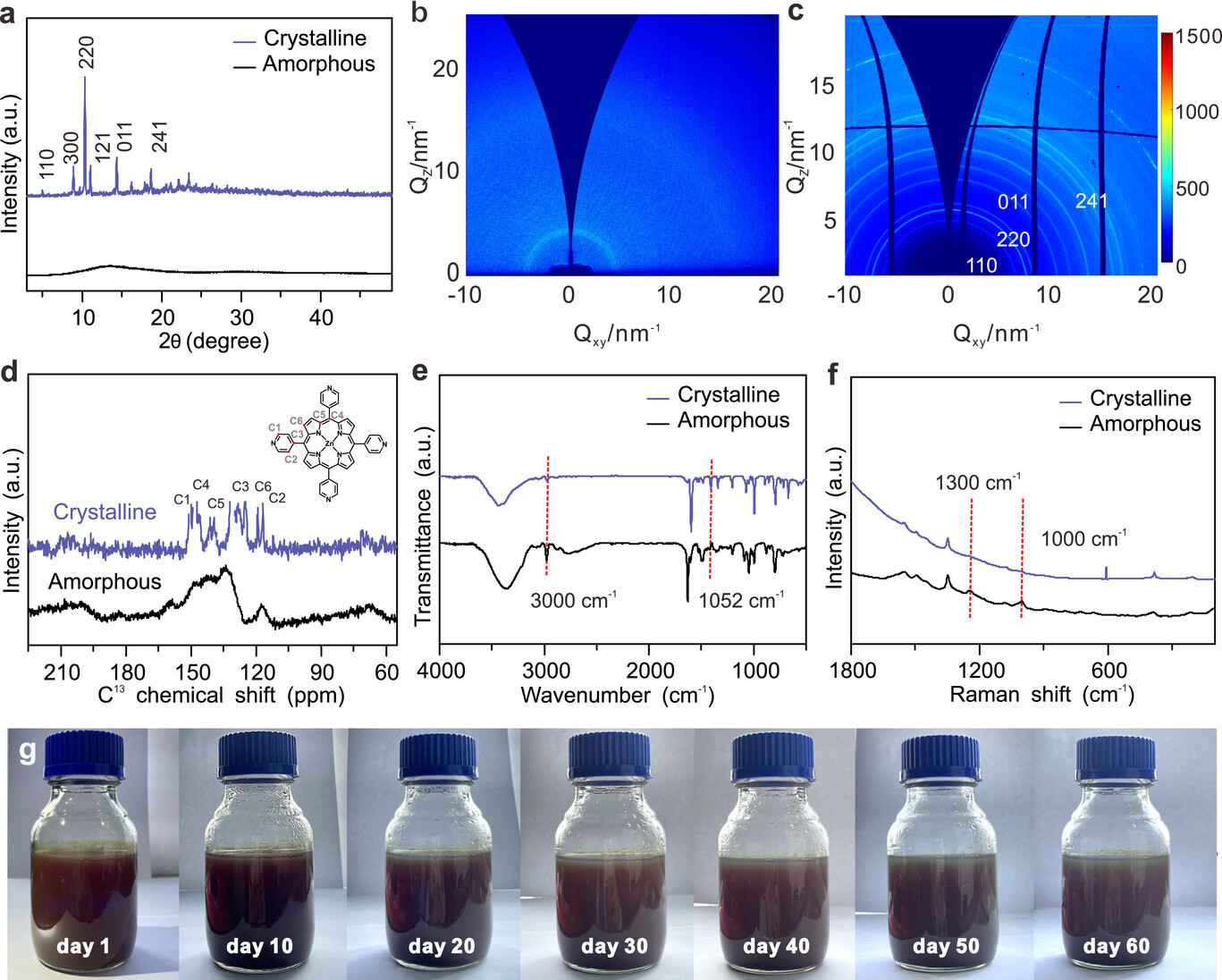 1. 结构与结晶性:XRD和GIWAXS证实无定形前驱体无结晶信号,结晶样品结晶度高、相纯度好;13C ssNMR显示结晶样品有清晰共振信号(150 ppm等对应特征碳原子),无定形样品峰形宽化。