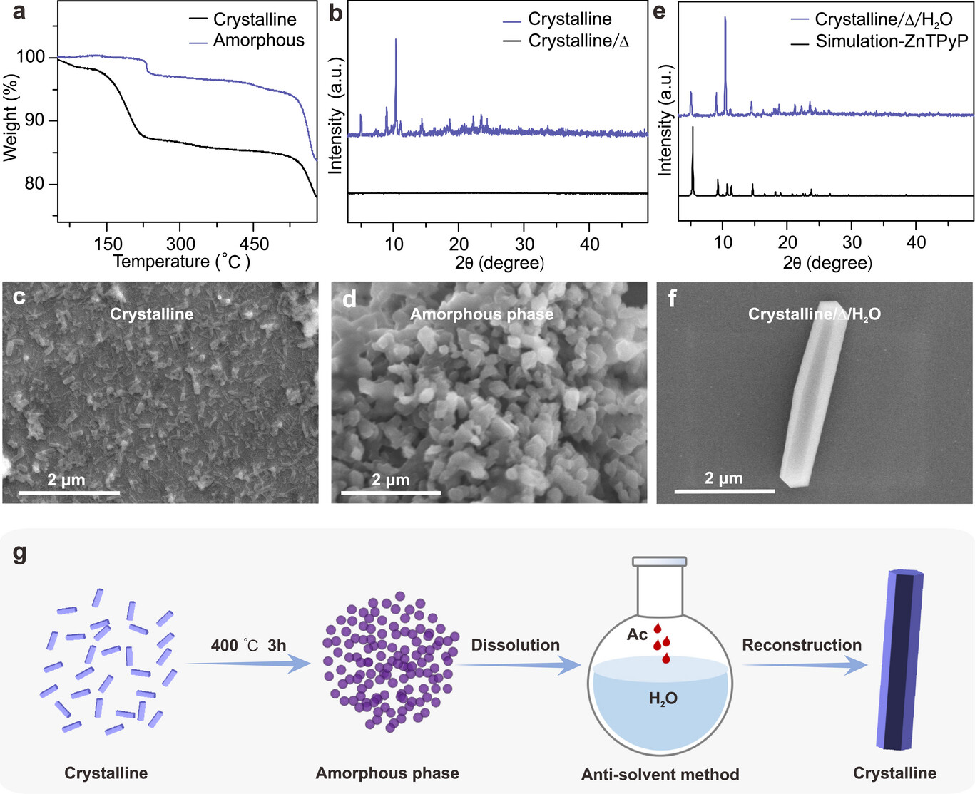 1. 本研究提出水簇介导的无定形-结晶转变策略,无需表面活性剂,通过超声辅助制备无定形ZnTPyP前驱体,水触发结晶形成三维蜂窝晶格MOF纳米催化剂;