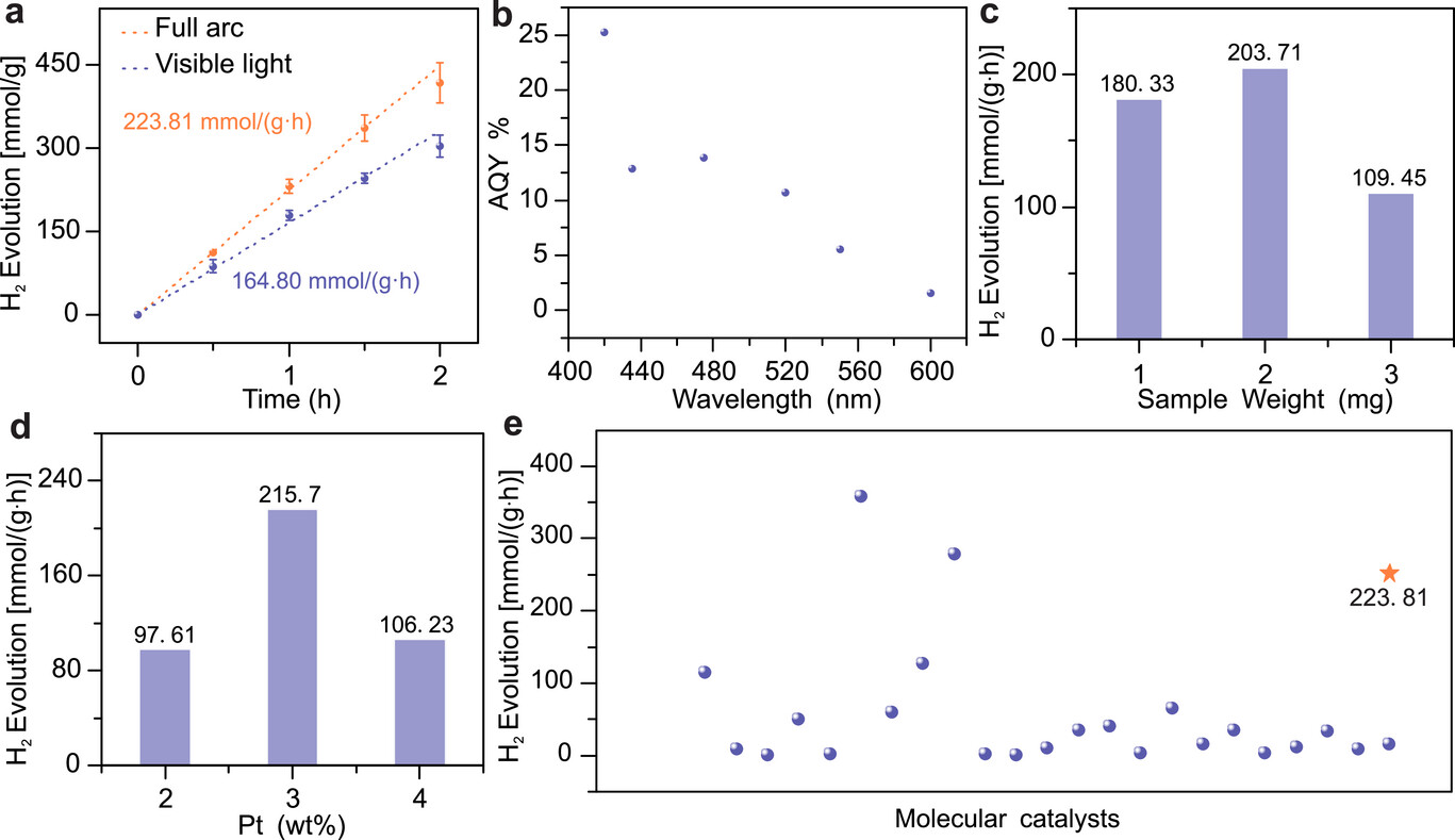 2. 该催化剂具有优异的水解稳定性(水中稳定超过2个月)和规模化制备潜力(1000 mL规模收率76.02%),析氢速率达223.81 mmol g⁻¹ h⁻¹,420 nm处AQY达25.2%,性能跻身分子光催化剂前列。