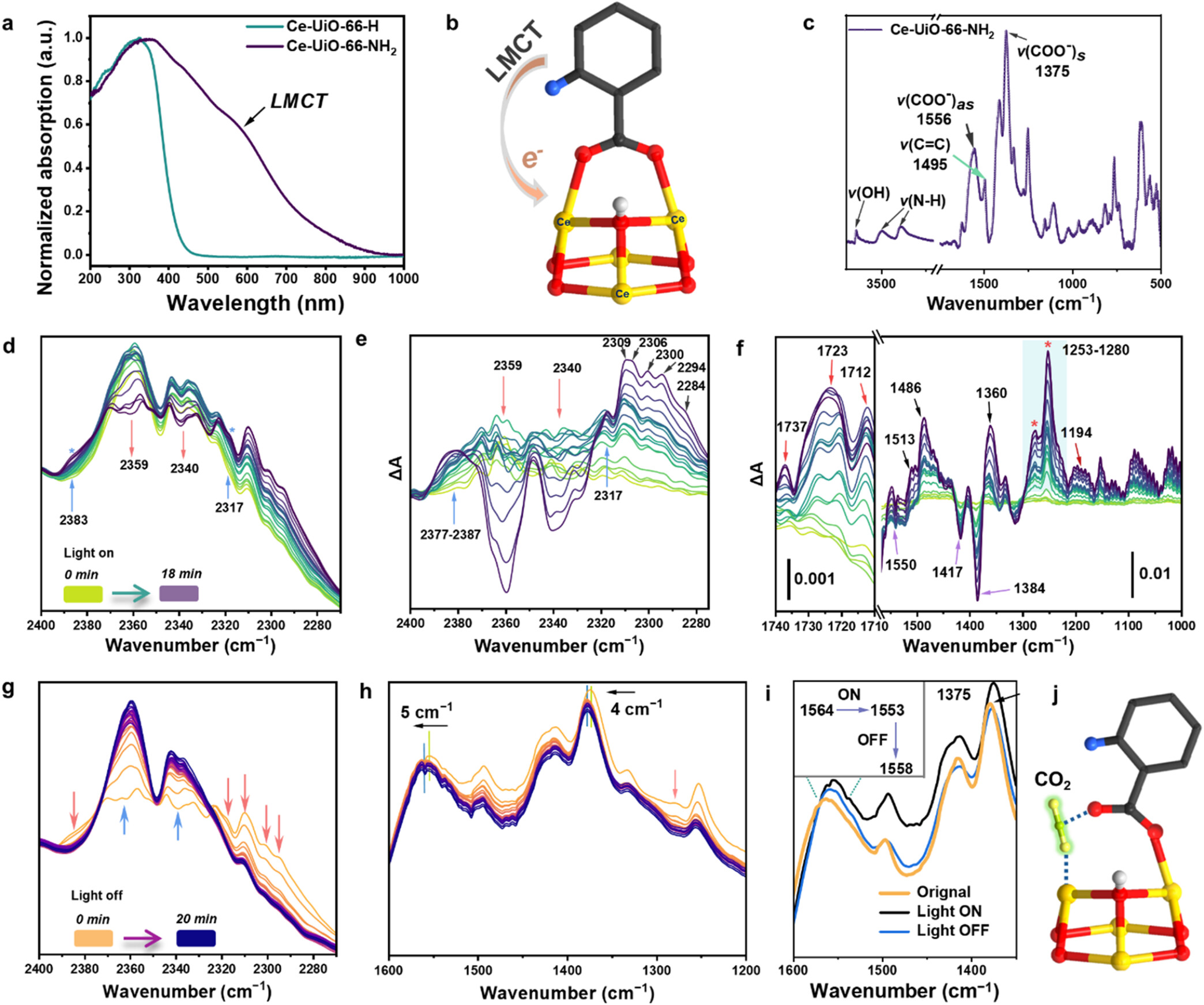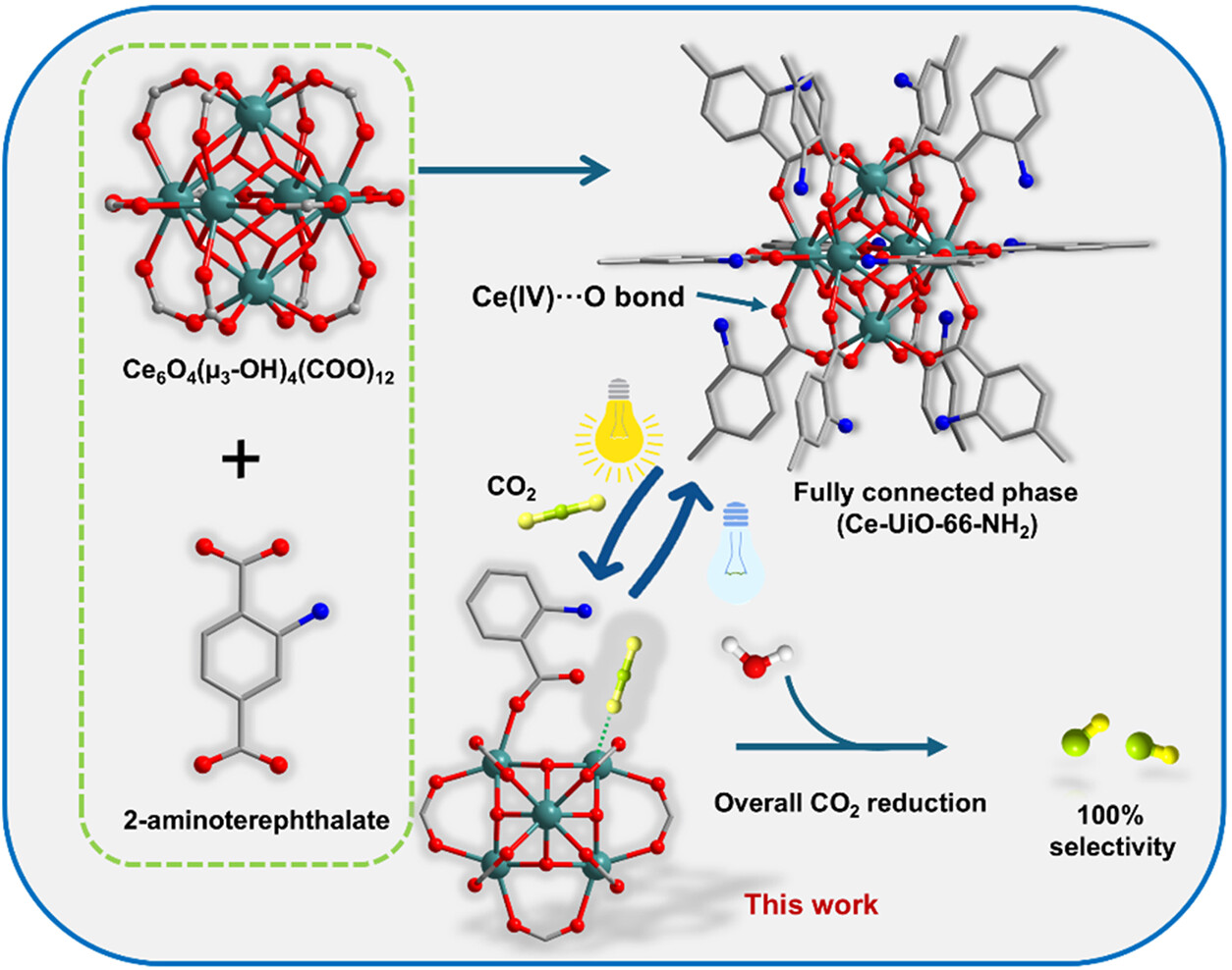 【Ce-UiO-66-NH2】光诱导瞬态开放Ce(III)位点实现MOF中CO₂的可逆结合与还原