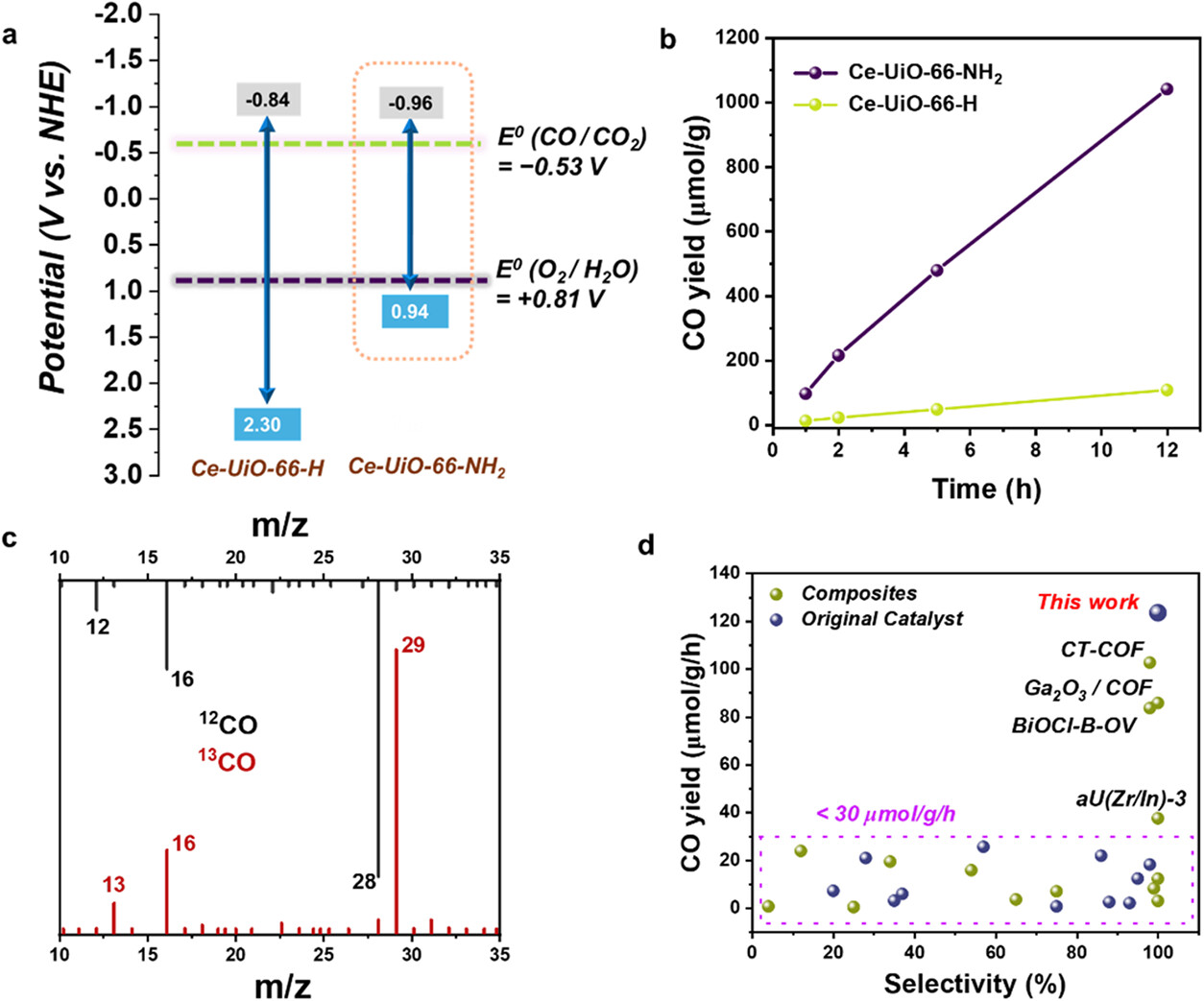 1) UV-vis光谱显示Ce-UiO-66-NH₂带隙窄至1.90 eV(Ce-UiO-66-H为3.14 eV)。Mott-Schottky测试确定其导带位置为-0.96 V (vs. NHE),足以驱动CO₂/CO还原(-0.53 V),价带位置满足水氧化需求。