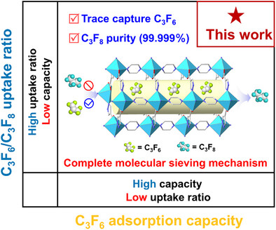 1. 行业痛点: 八氟丙烷(C3F8)是集成电路刻蚀与清洗的核心电子特气,其纯度需达到99.999%以上。然而,生产过程中不可避免地混入沸点极近(相差仅约6 K)、分子尺寸差异极小(亚埃级)的副产物六氟丙烯(C3F6)。传统深冷精馏能耗巨大且难以达到超高纯度,而现有 porous 吸附剂面临核心矛盾:窄孔道材料虽能筛分但容量低,大孔道材料容量高但选择性差,动态孔道材料易导致共吸附,无法兼顾高容量与高选择性。