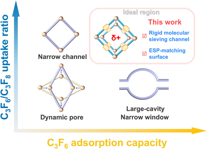 2 . 现有方案: 学者们尝试利用MOFs的可调性进行分离,主要策略包括尺寸筛分、热力学平衡分离等。但针对C3F6/C3F6这一极具挑战的体系,现有MOFs(如Al-PMA, Zn-bzc-CF3等)要么受限于过小的孔径导致C3F6扩散受阻、容量低,要么因窗口-空腔连接处的微小间隙导致C3F8渗漏,分离系数普遍较低(大多<40),无法满足工业级痕量脱除需求。