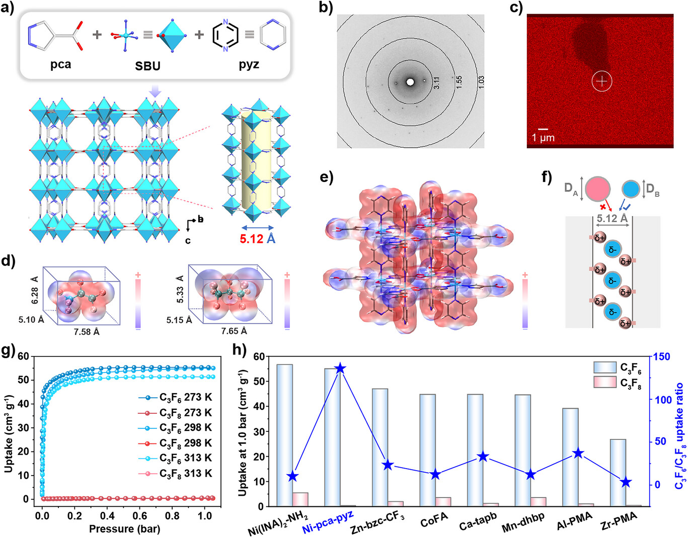 3. 本文创新: 受生物酶特异性识别启发,作者提出“尺寸筛分+静电势互补”双重调控策略。利用柱层状结构预设刚性一维孔道,精准控制孔径介于C3F6与C3F8之间实现物理筛分;同时在孔壁引入富氢配体,构建正静电势陷阱,通过多重C-F···H氢键增强对C3F6的特异性亲和力。这种协同效应成功打破了容量与选择性的权衡限制。