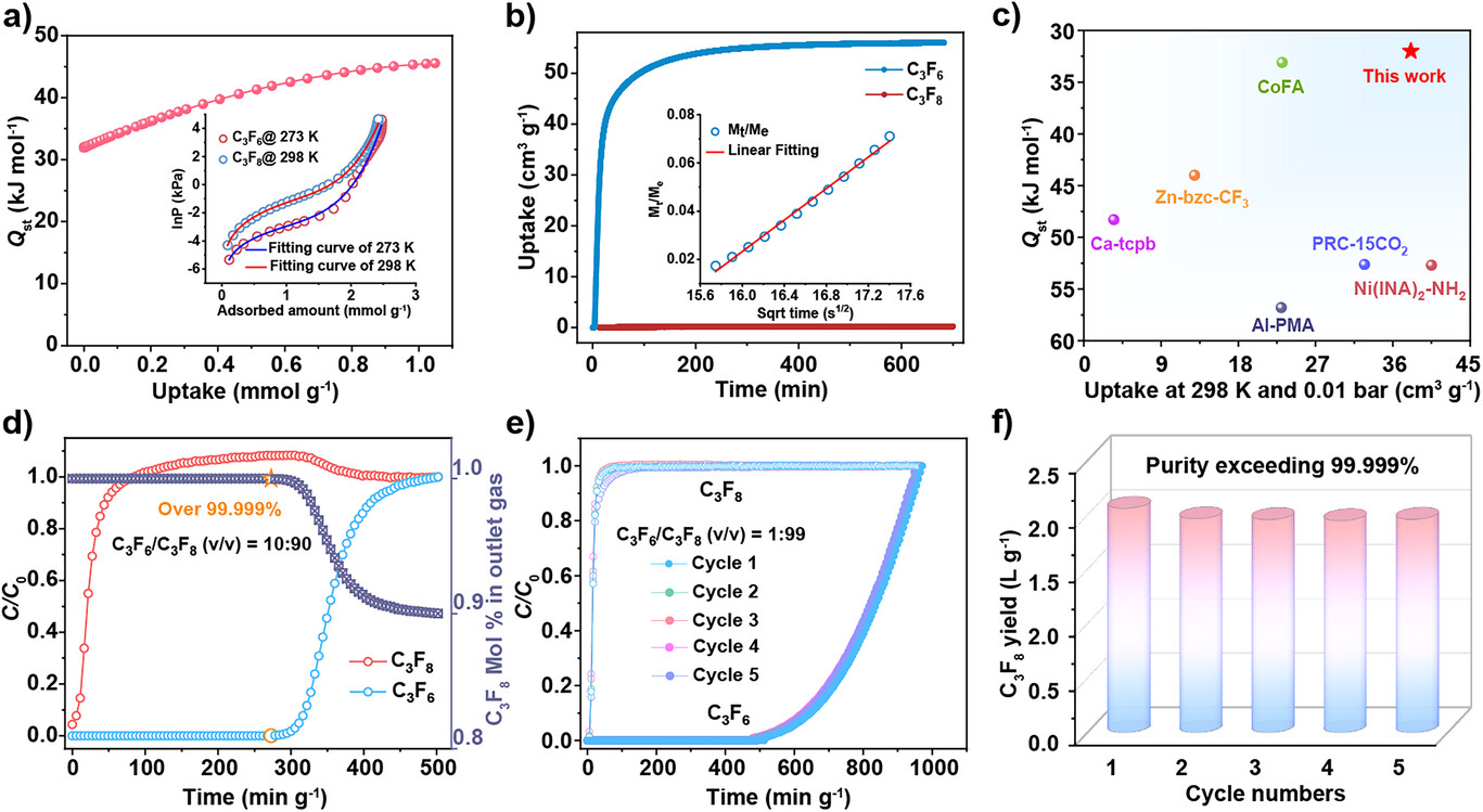 3. 动态穿透实验: 搭建固定床吸附柱,通入不同比例(50:50, 10:90, 1:99)的C3F6/C3F8混合气。在1:99模拟工业痕量杂质工况下,C3F8立即穿透,而C3F6被牢牢截留。流出气中C3F8纯度稳定超过99.999%,单次穿透C3F8产率高达2.06 × 10³ L kg⁻¹。连续5次循环及存放1年后的样品性能无衰减。