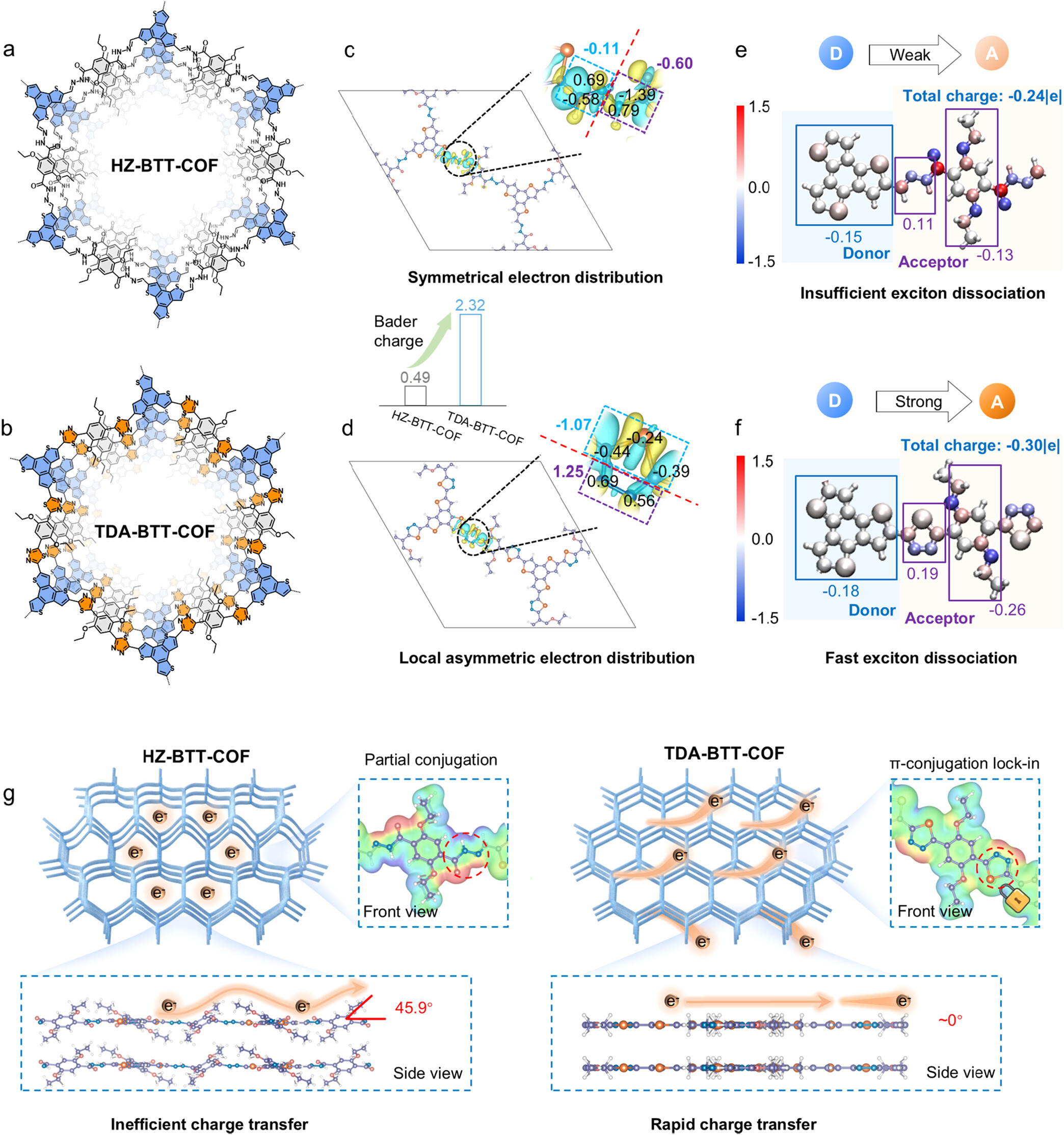 1) 提出共轭锁定增强结合不对称电子分布设计思路,以劳森试剂为硫代化试剂,将腙键 HZ-BTT-COF 转化为噻二唑基 TDA-BTT-COF;