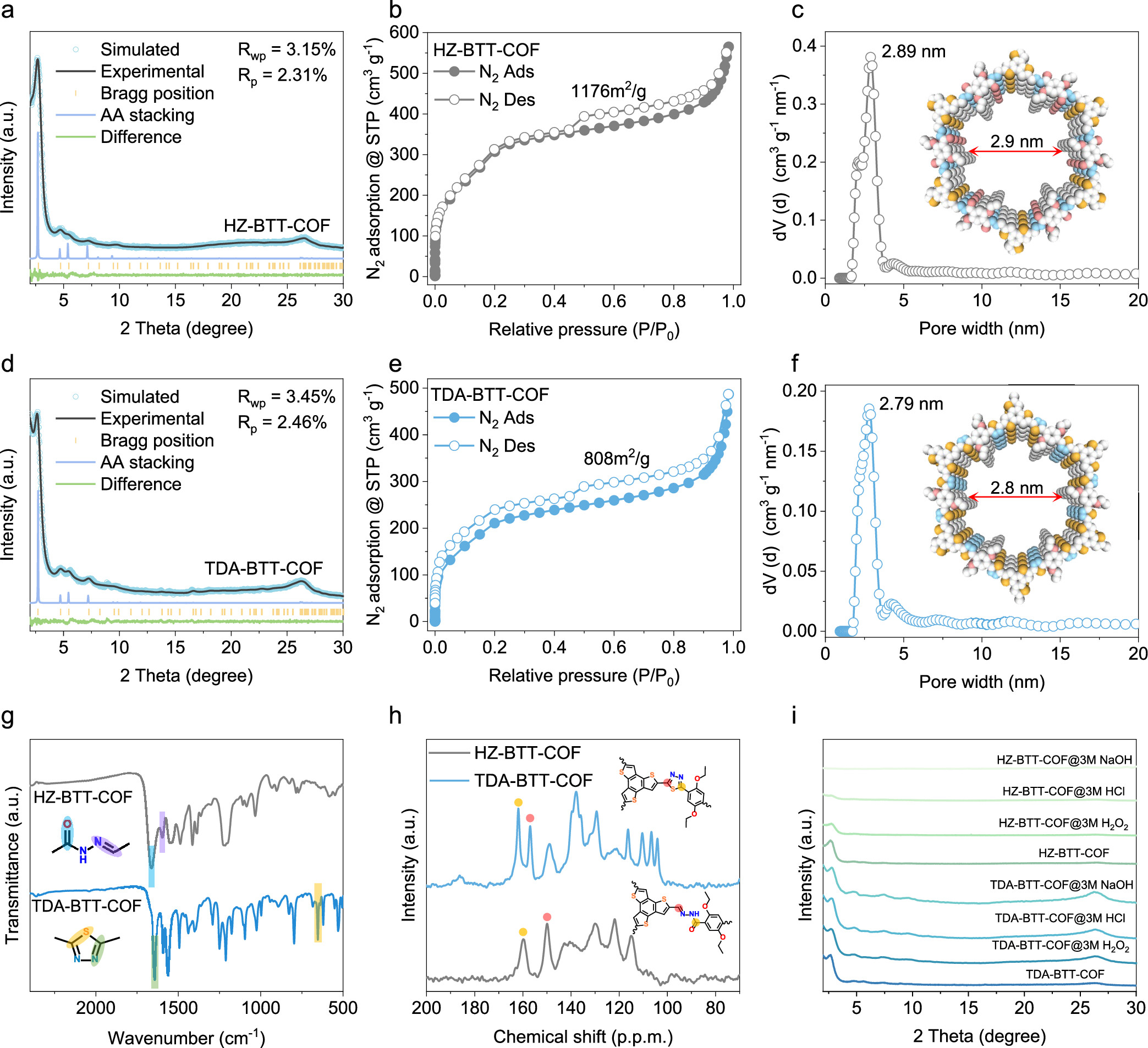 1) PXRD 证实 HZ-BTT-COF 和 TDA-BTT-COF 均为六方 P6/M 空间群、AA 堆叠,TDA-BTT-COF 晶胞参数 a=b=37.04 Å、c=3.41 Å,结晶度优异。FTIR 和固态 ¹³C ssNMR 证实腙键成功转化为噻二唑键;
