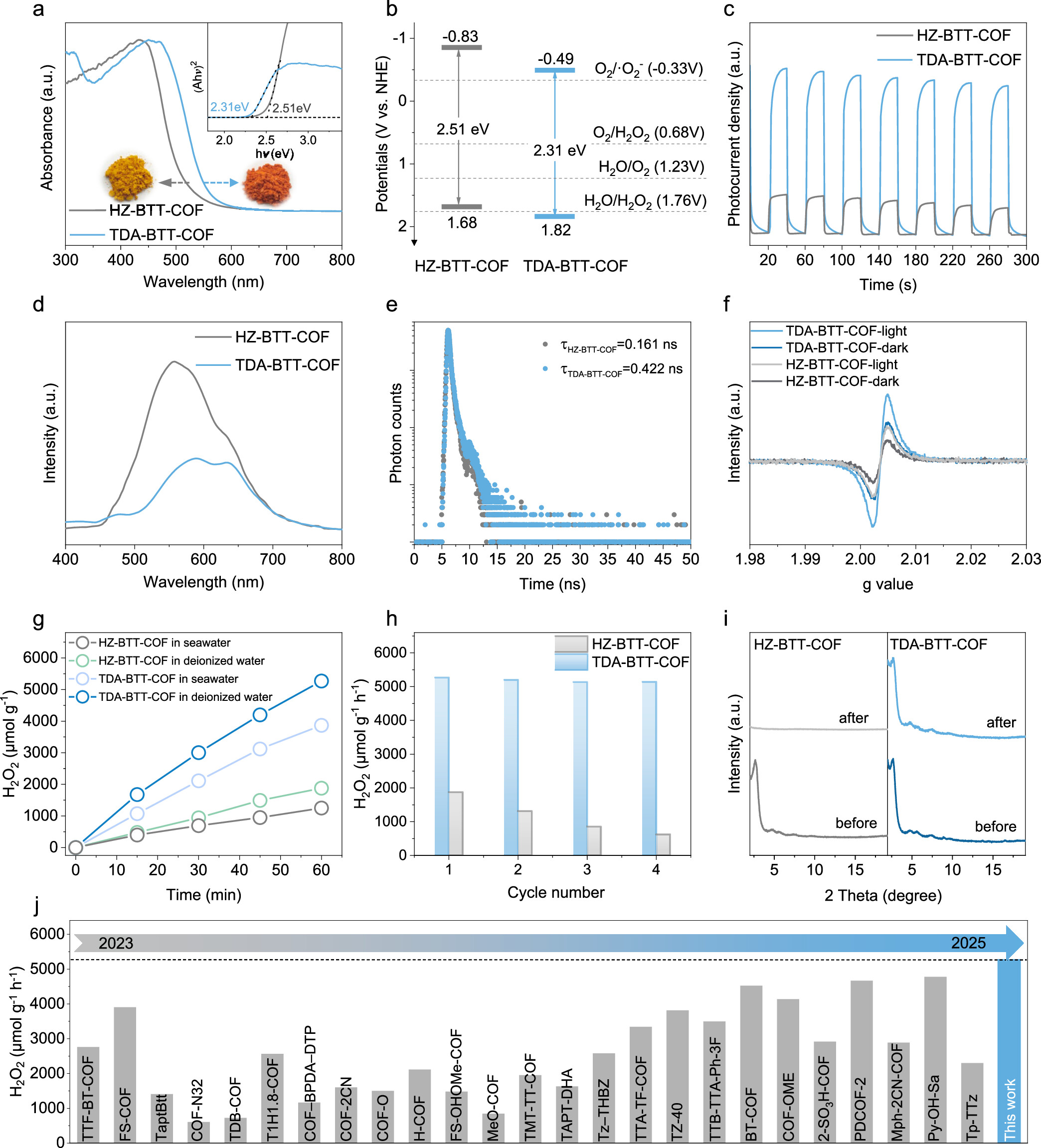 UV-vis DRS 测得 HZ-BTT-COF 和 TDA-BTT-COF 光学带隙为 2.51eV、2.31eV,后者可见光吸收更宽。Mott-Schottky 测试得平带电位 - 1.03V、-0.69V(vs NHE),导带 - 0.83V、-0.49V,价带 1.68V、1.82V。瞬态光电流、EPR 等测试表明,TDA-BTT-COF 电荷分离传输效率更高、载流子寿命更长(0.422ns),远优于 HZ-BTT-COF(0.161ns)。