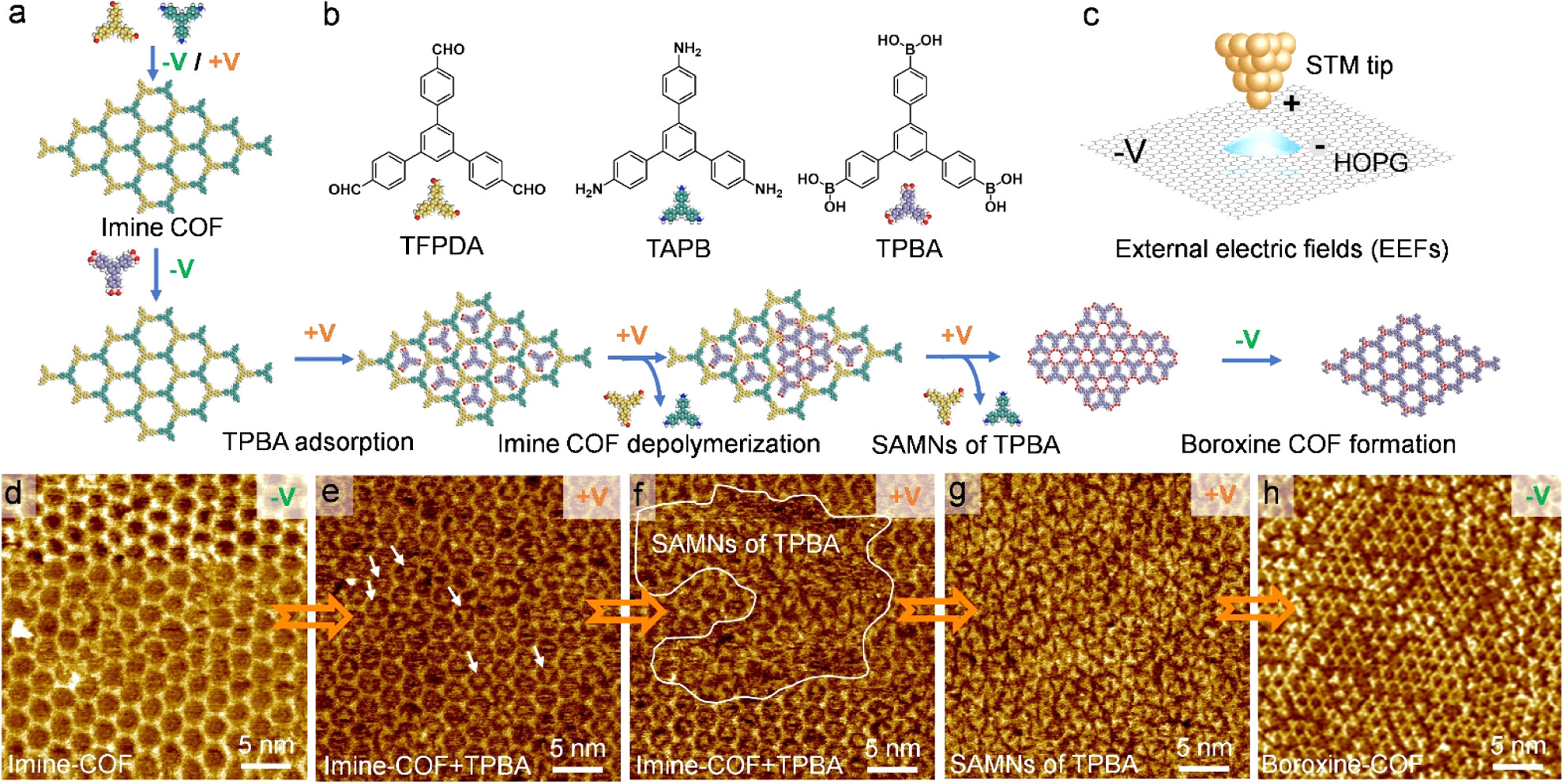 在亚胺 COF 表面滴涂 TPBA 溶液,负偏压(-0.6 V)下无 TPBA 吸附;正偏压(+0.3 V)下 TPBA 吸附于 COF 孔道,持续扫描引发解聚并形成 TPBA 自组装网络;再次切换负偏压,TPBA 组装体转化为硼氧六元环 COF,验证了可控的表面结构转化。