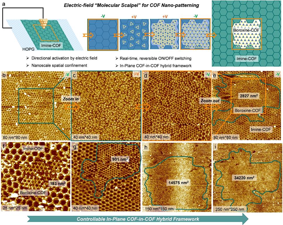 1. 提出电场介导的分子手术刀全新策略,成功实现高稳定性亚胺单层 COF 的可编程 C=N 键切割与纳米尺度重构,首次以纳米精度构筑了亚胺 / 硼氧六元环 COF 面内杂化骨架,填补了亚胺 COF 动态空间可编程调控的空白。