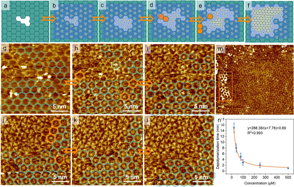 解聚从缺陷丰富、稳定性低的区域启动,逐步向有序畴区扩展,呈 “边缘向中心” 收缩,解聚释放的单体可再聚合实现 COF 部分再生,证明亚胺键的可逆性,再生空间差异源于基底与 COF 表面的热力学稳定性不同。
