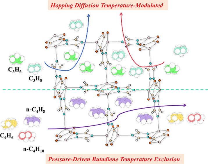 2) 提出温度调控跳跃扩散分离新策略,实现丙烯/丙烷可逆选择性调控;利用门控柔性实现低压力、低能耗丁二烯精制