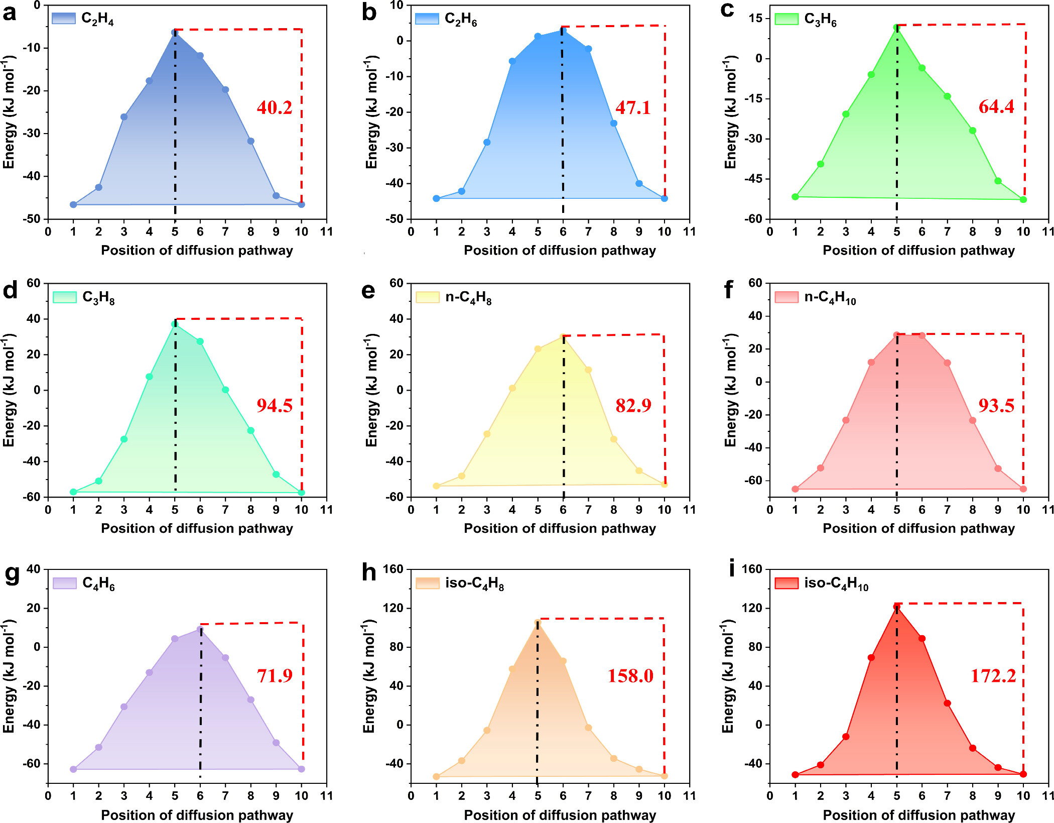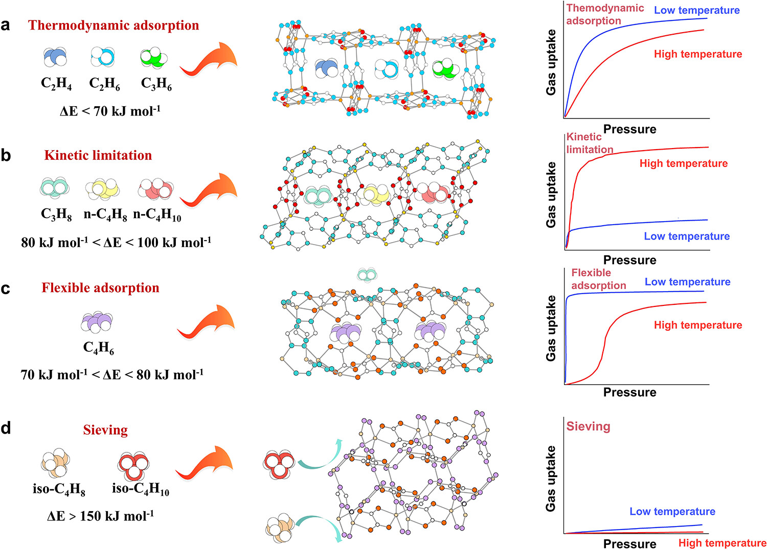 2. 吸附动力学:通过吸附动力学拟合测得,9种轻质烃扩散能垒差异显著:丙烯、乙烯等<70kJ/mol,低温扩散顺畅;丙烷、正丁烷介于80-100kJ/mol,低温扩散受阻;异丁烷/烯>150kJ/mol,完全无法进入孔道;丁二烯介于70-80kJ/mol,可触发孔道门开效应。