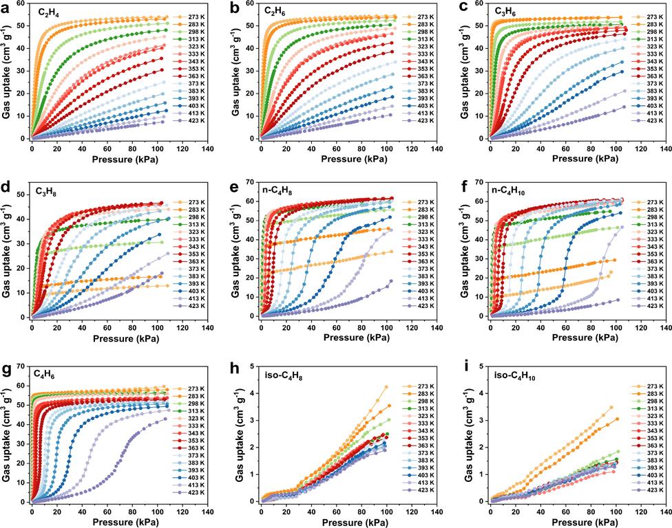 1. 多组分烃类吸附:使用CALF-20 (点击进入相关产品链接)作为吸附剂选取乙烯、乙烷、丙烯、丙烷等9种工业关键轻质烃,在273-413K温度区间内测试变温吸附等温线,定量分析吸附热力学与动力学特性。结果显示:C2烃、丙烯遵循热力学吸附规律,吸附量随温度升高降低;丙烷、正丁烯/烷受动力学限制,低温吸附量极低,高温吸附量提升;丁二烯呈现门控柔性吸附特征;异丁烯/烷完全被筛分,吸附量可忽略。