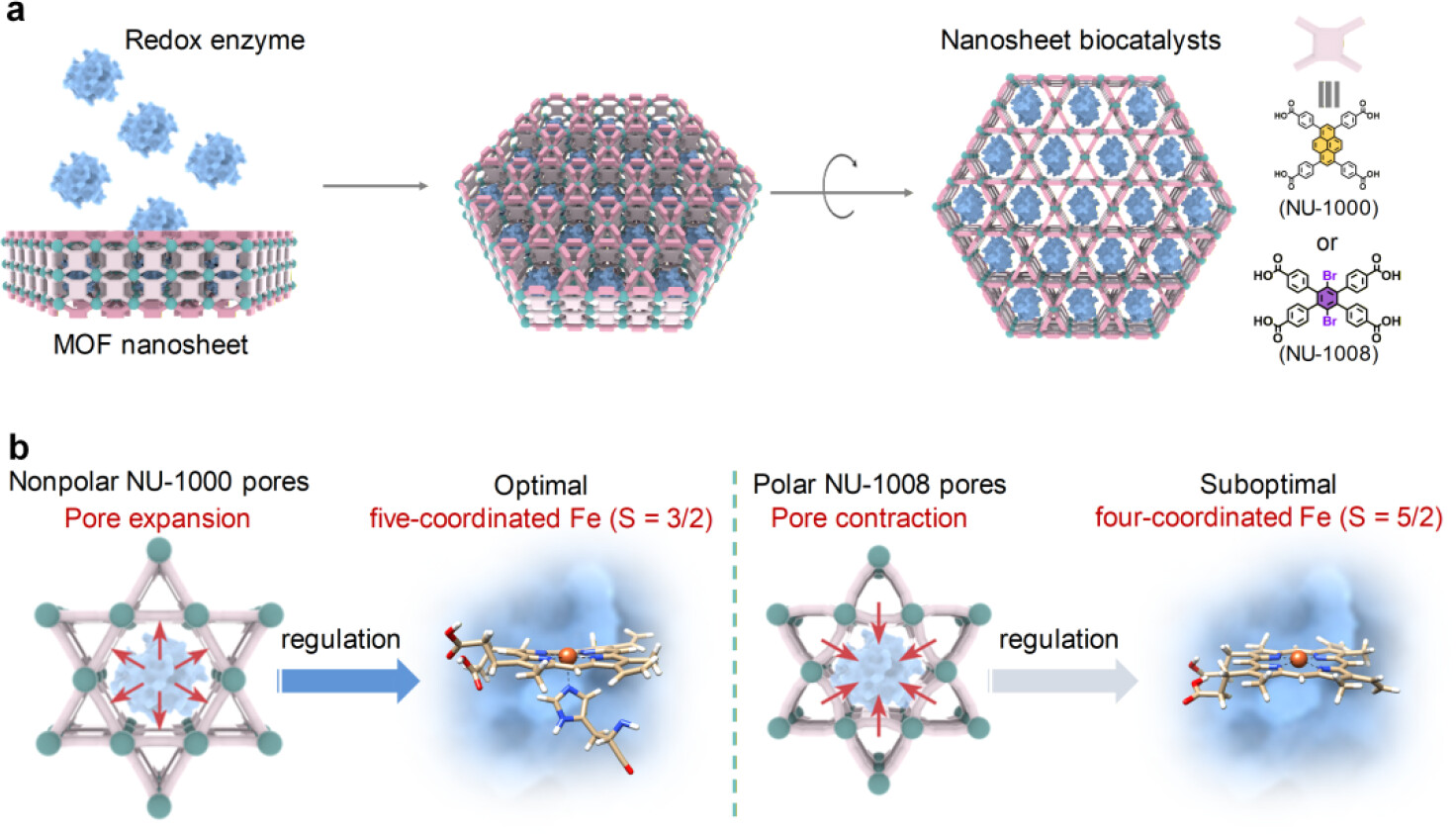 中山大学陈国胜、欧阳锋钢,华南理工韩宇、重庆大学刘玲梅等联合报道的研究(J. Am. Chem. Soc. 2026, DOI: 10.1021/jacs.5c22730)中选用NU-1000、NU-1008两种同构锆基MOF纳米片为载体,包埋细胞色素c(Cyt c)构建双功能氧化生物催化剂,首次直观证实MOF“刚性”孔道的自适应形变行为。借助低剂量电子显微镜,直接观测到非极性NU-1000孔道扩张、极性NU-1008孔道收缩的差异化响应,孔道扩张促使Cyt c的血红素铁从六配位(S=1/2)转变为高活性五配位(S=3/2),催化氧化活性较游离酶提升一个数量级。该生物催化剂通过高价铁(IV)-氧中间体机制,实现有毒有机污染物的高效降解,性能远超现有纳米催化剂。本研究打破载体为静态惰性支架的传统认知,为孔道限域下酶催化反应的机制解析与材料设计提供全新思路。