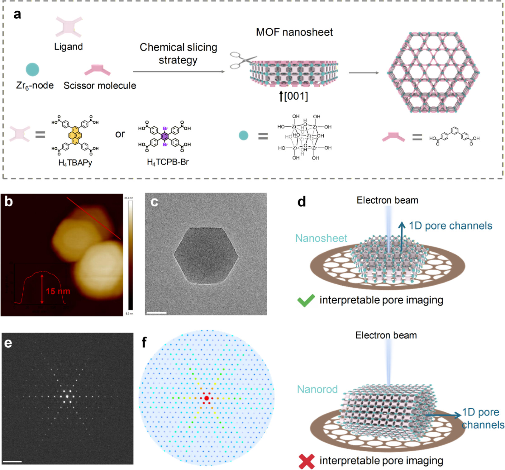 1. MOF纳米片可控制备:采用化学切割策略,以[1,1′,3′,1″-三联苯]-4,4″-二羧酸TPCA为切割分子,抑制晶体沿[001]方向生长,制备厚度15-70 nm可调的六方形NU-1000、NU-1008纳米片,筛选15 nm超薄纳米片用于后续实验,保证电子束穿透与孔道结构观测。