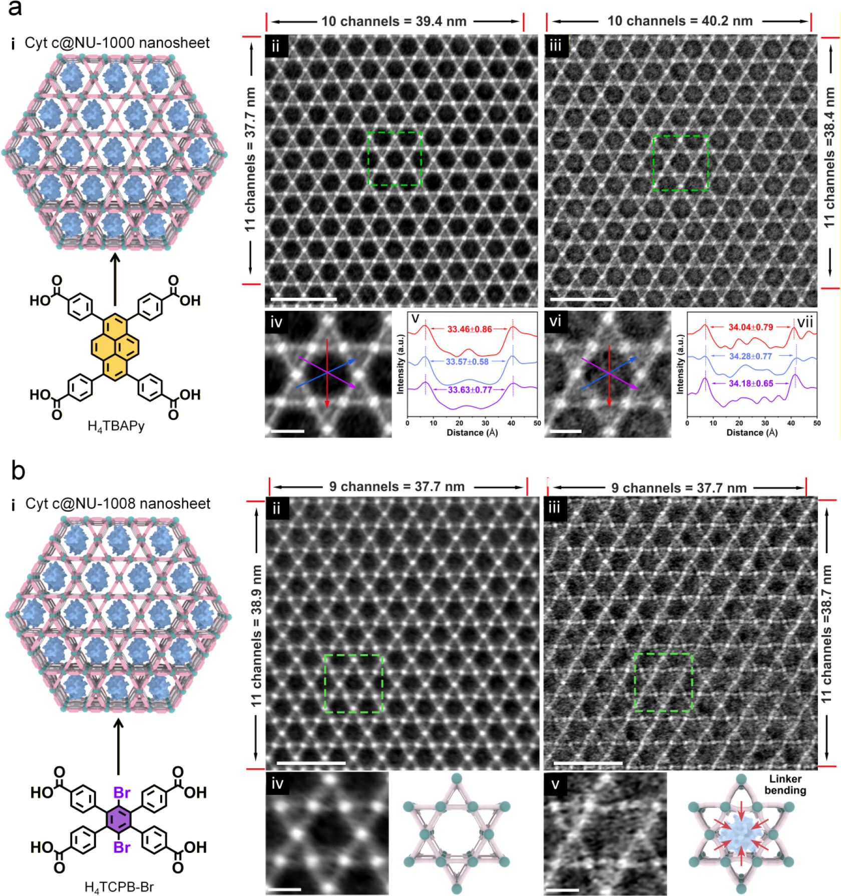 1) 设计同构、极性差异化的NU-1000/NU-1008 MOF纳米片,利用化学切割法制备超薄纳米片(15 nm),便于电子显微镜表征;首次通过低剂量iDPC-STEM直接观测孔道自适应形变;