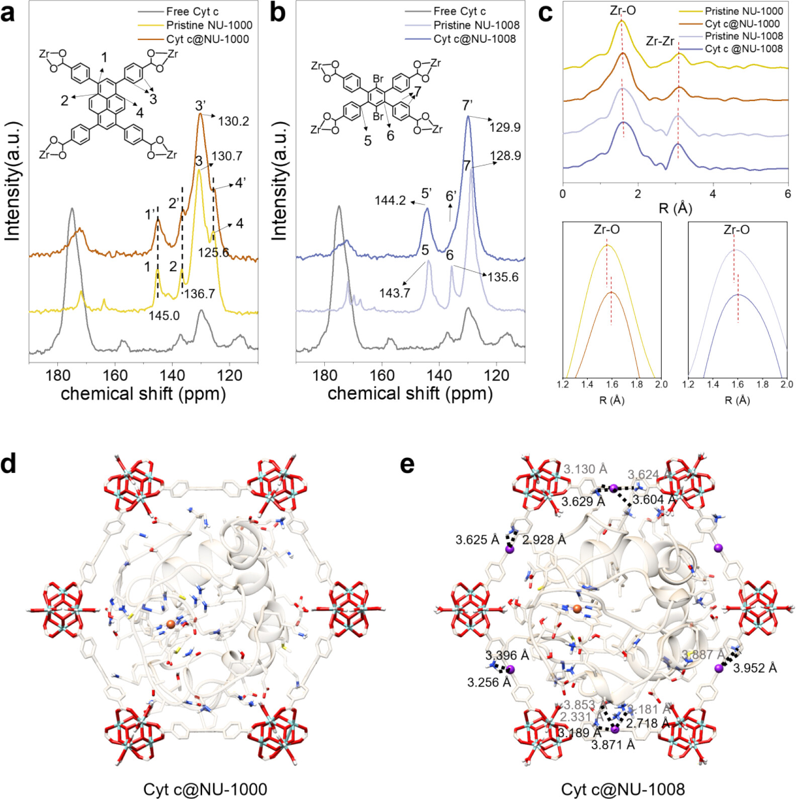 3. 谱学与自旋态:ESR证实Cyt c@NU-1000血红素铁为五配位高自旋(S=3/2),Cyt c@NU-1008为四配位高自旋(S=5/2);EXAFS显示酶负载后Zr-O键伸长,Zr-Zr键不变,Zr-O配位键扭曲;XPS证实Zr 3d结合能降低,配位键弱化。