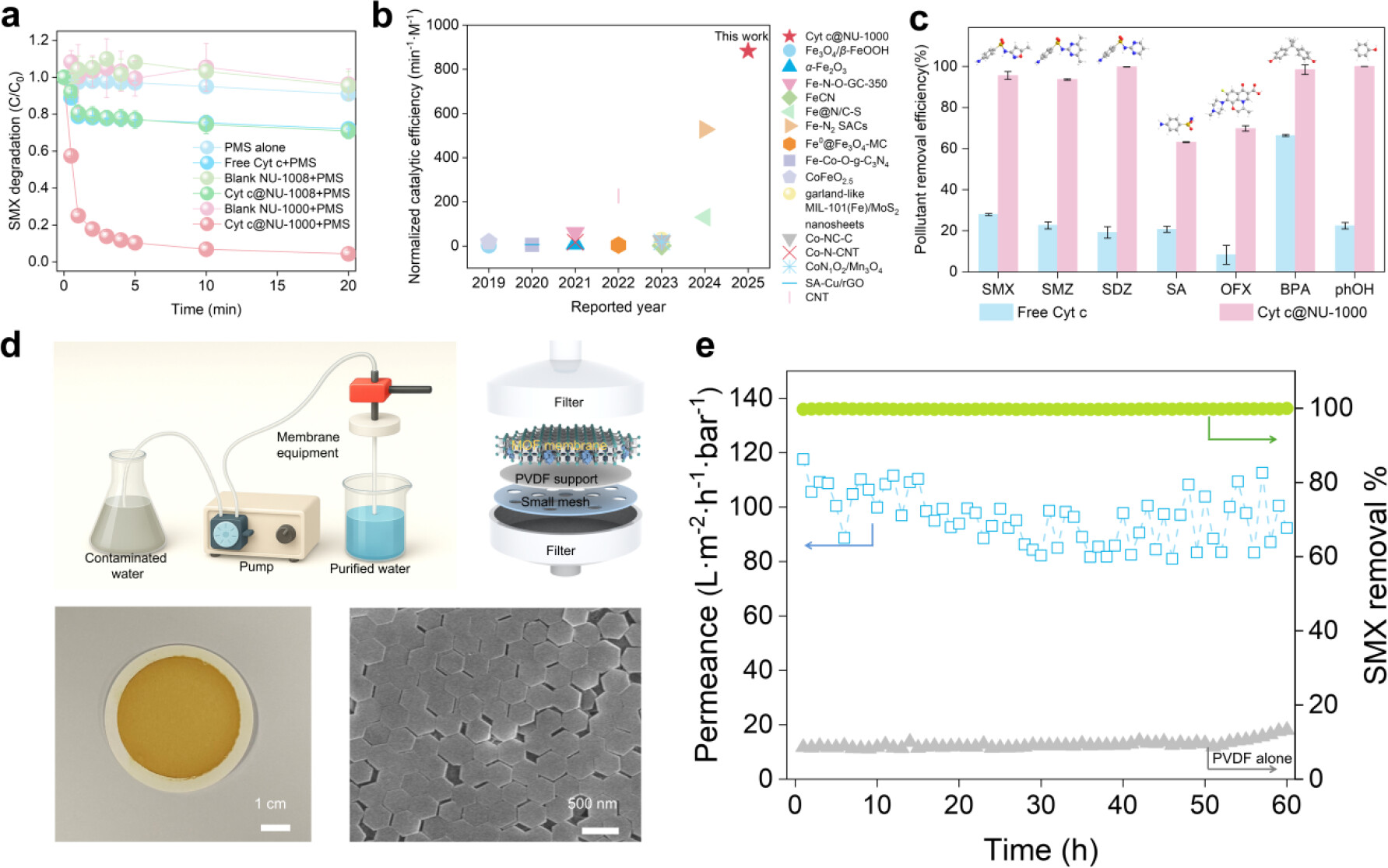 4. 稳定性与膜性能测试:Cyt c@NU-1000在pH=2.5、60℃条件下保留高活性,室温储存30天仍有65%活性;连续流膜60 h运行后结构完整,无酶泄漏,SMX去除率稳定>99%。