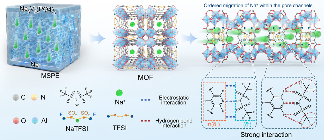 西北大学侯磊和中国矿业大学的赵丹阳、李泳志等研究团队在(Angew. Chem. Int. Ed. 2026,DOI: 10.1002/anie.202525120)发表的研究中,针对全固态聚合物钠金属电池(ASSP-SMBs)钠盐解离不足、离子迁移失衡的核心难题,将孔限制与表面极化作用整合到MOF材料CAU-10-PyDC中。该MOF中吡啶氮原子的吸电子效应形成局部正电微环境,可强力锚定阴离子、促进NaTFSI解离,构建低能垒离子解耦传输通道。由其协同增强的PyDC-MSPE电解质可诱导形成稳定无机富SEI和CEI层,有效抑制枝晶生长和界面副反应。测试表明,PyDC-MSPE离子电导率达3.37×10⁻⁴ S cm⁻¹,Na⁺迁移数0.75;Na|PyDC-MSPE|Na₃V₂(PO₄)₃电池2C倍率循环1000次后比容量为111.2 mAh g⁻¹,软包电池能量密度325.7 Wh kg⁻¹,100次循环容量保持率87.7%。该研究揭示孔限制与表面极化协同调控离子传输的新机制,为解决ASSP-SMBs核心难题提供有效途径。