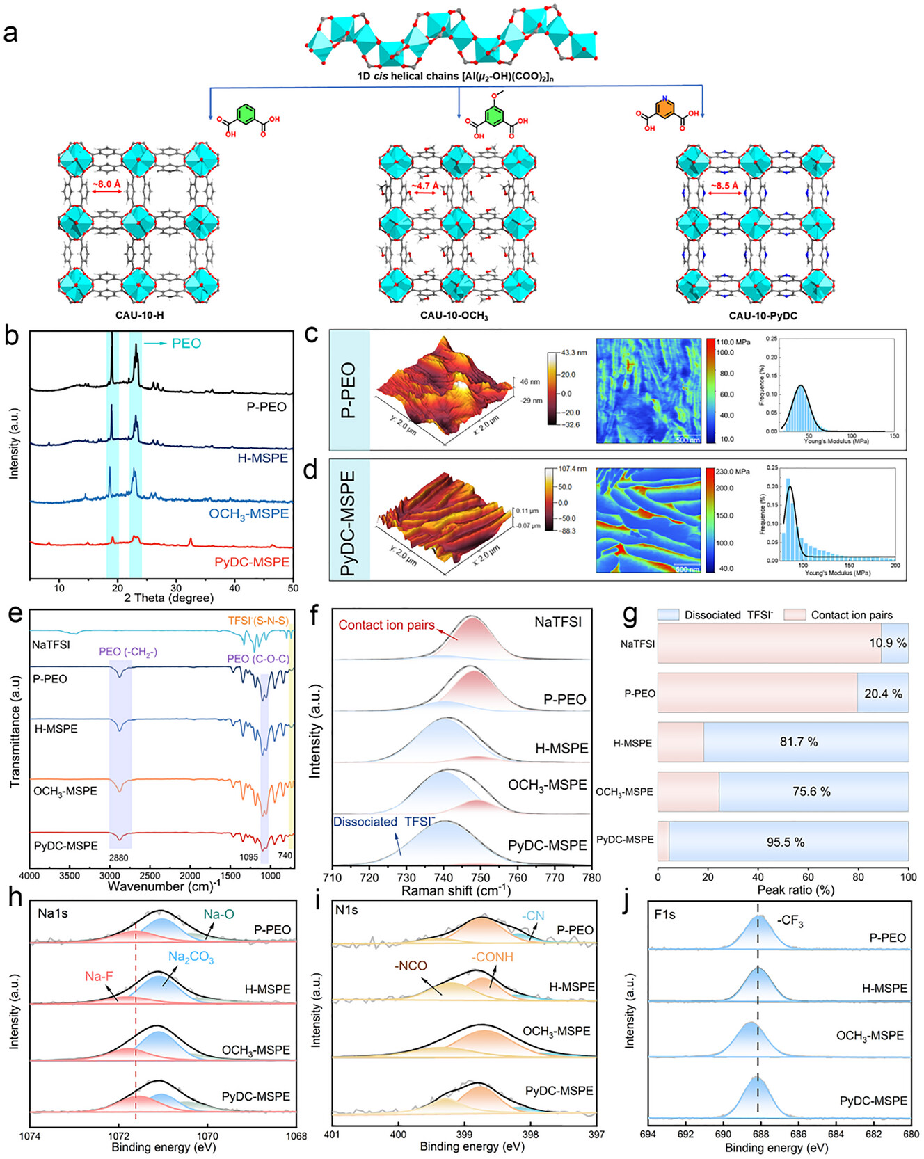 提出MOF协同增强电解质(MSPE)策略,通过改性将CAU-10-H通道内碳原子替换为吡啶氮原子,制备CAU-10-PyDC。其吡啶氮原子未与金属中心配位,吸电子能力强,可形成局部正电微环境,通过静电作用锚定TFSI⁻、促进NaTFSI解离,同时优化孔径实现Na⁺高效传输,突破现有填料局限。