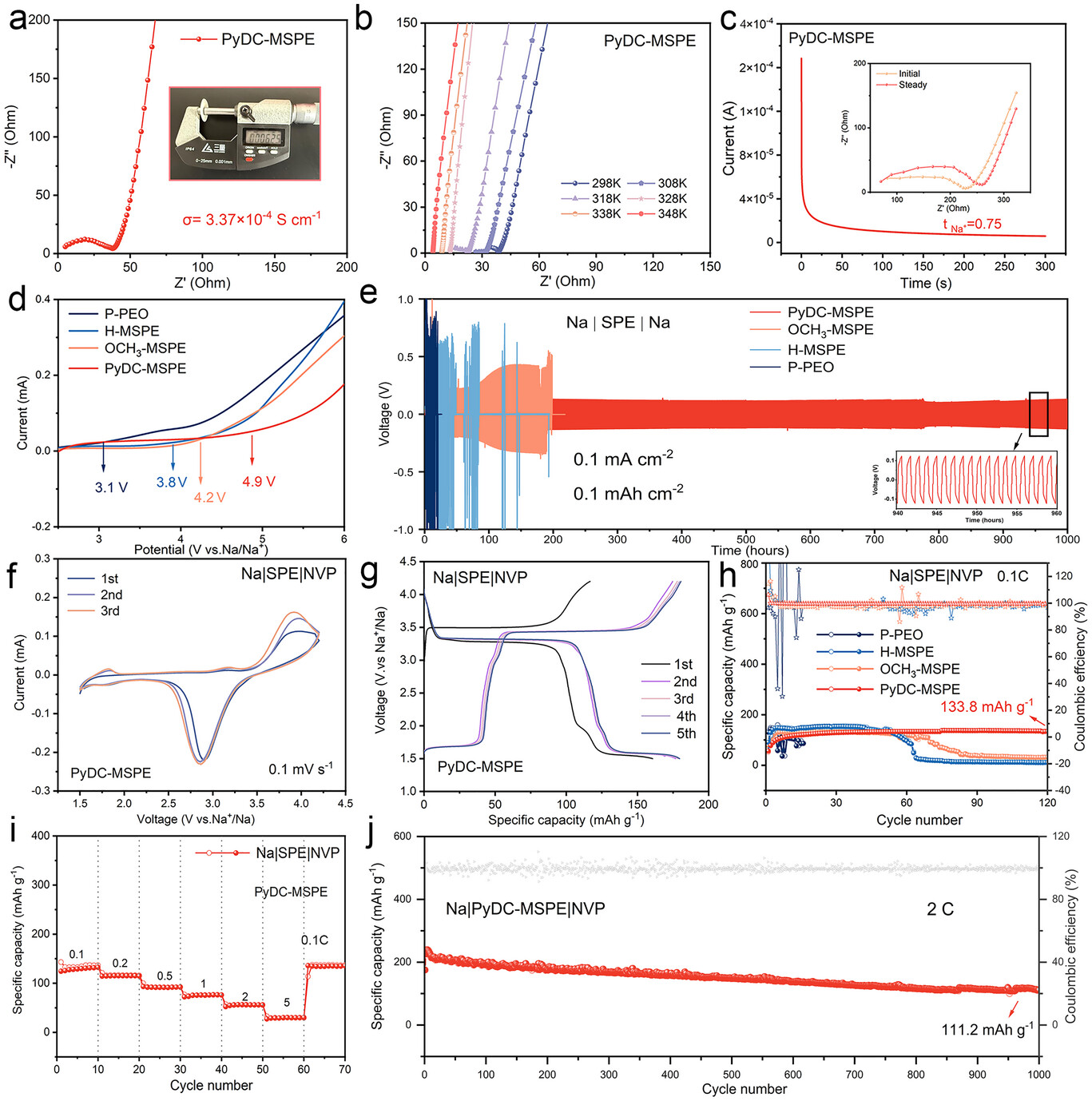 1) PyDC-MSPE室温离子电导率3.37×10⁻⁴ S cm⁻¹(是P-PEO的23倍),活化能0.31 eV,Na⁺迁移数0.75,氧化分解电位4.9 V;