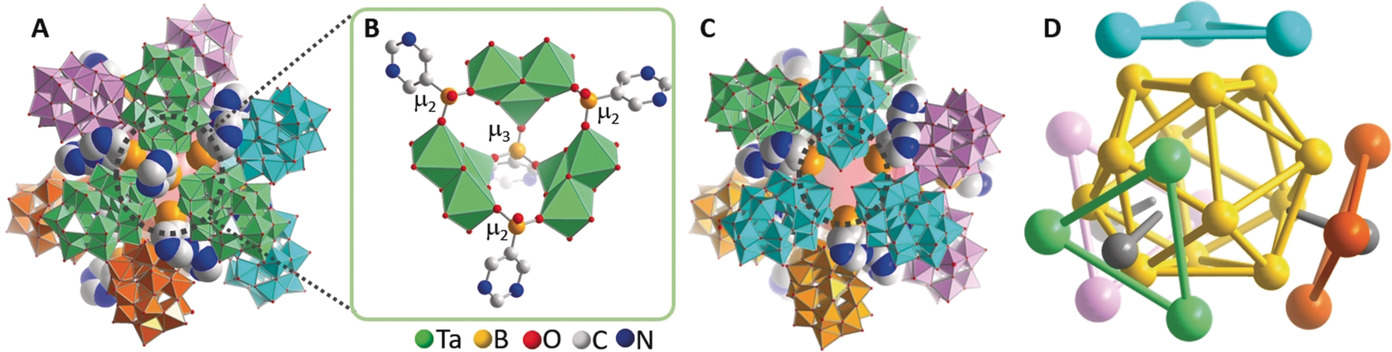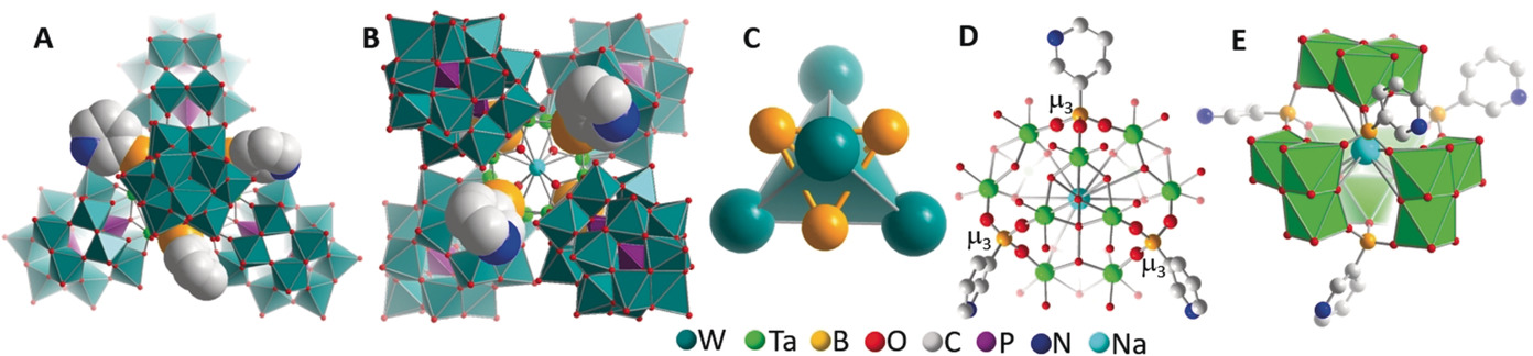 四聚体胶囊(1-Ta/1-Nb):四个{M₃W₁₅}单元通过四个3-吡啶硼酸连接成四面体结构,直径约2.8 nm。每个硼原子以三齿方式连接三个POM单元,形成十二个B-O-M键。中心封装一个Na⁺离子。