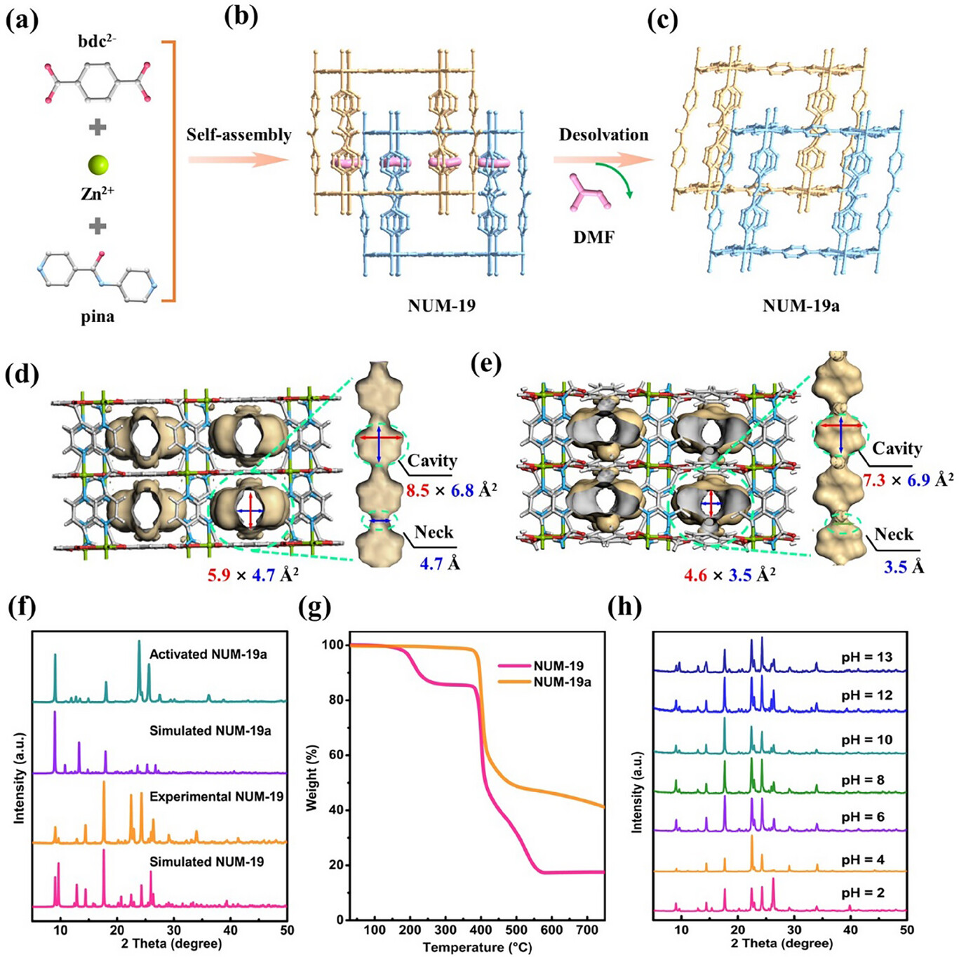 以 Zn(OH)₂、对苯二甲酸(H₂bdc)、N‑(吡啶‑4‑基)异烟酰胺(pina)为原料,氟硼酸为调节剂,在 DMF/甲醇混合溶剂中 100 ℃溶剂热反应 24 h 得到 NUM‑19 单晶。经高温真空脱除 DMF 溶剂后,得到活化样品 NUM‑19a,实现大孔相到窄孔相的可逆结构转变。
