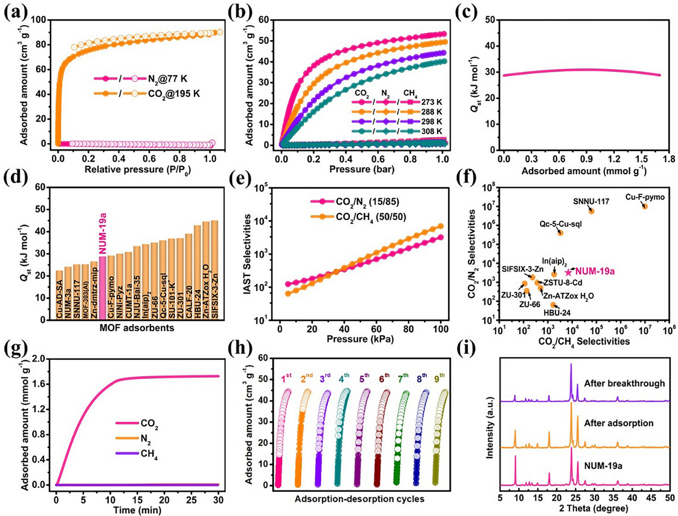 2) 在 273–308 K、1 bar 下测试 CO₂、N₂、CH₄ 吸附。NUM‑19a 在 298 K 时 CO₂ 吸附量为 1.98 mmol g⁻¹,而 N₂ 与 CH₄ 在全温度区间内均无明显吸附,表现出完全分子排斥效应。循环吸附‑脱附 10 次以上性能无衰减。