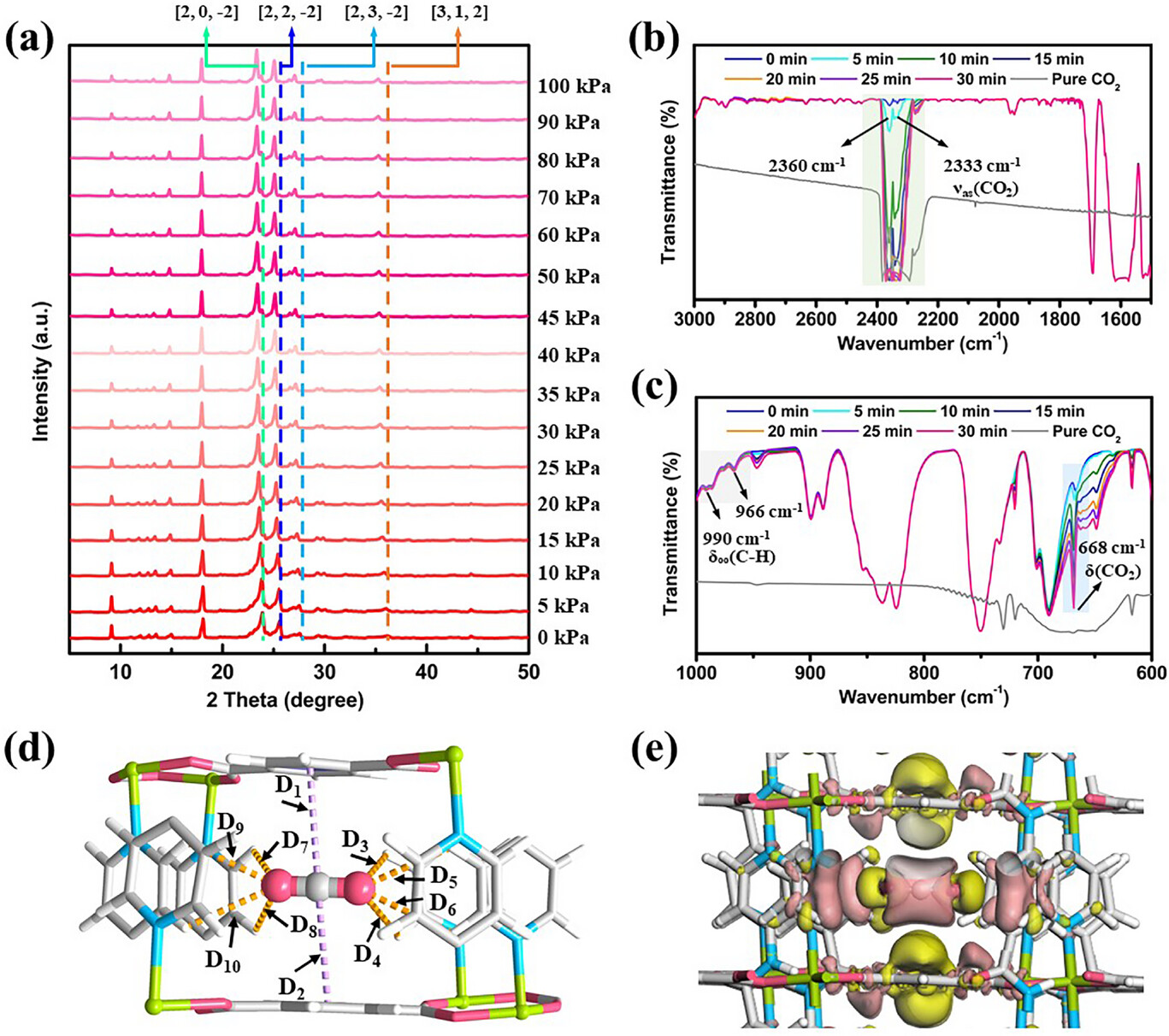 原位 PXRD 显示随 CO₂ 压力升高,衍射峰轻微位移,表明晶格连续可逆膨胀;原位红外观察到 CO₂ 特征峰与骨架 C‑H 振动增强,证实主客体弱相互作用。