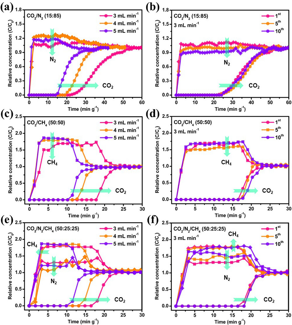 模拟工业气氛开展二元 CO₂/N₂(15:85)、CO₂/CH₄(50:50)及三元 CO₂/N₂/CH₄ 混合气体穿透测试。N₂、CH₄ 3 min 内迅速出峰,CO₂ 保留时间显著延长;IAST 计算 CO₂/N₂ 选择性 3226,CO₂/CH₄ 选择性 7010,处于已报道 MOF 顶尖水平。多次循环与潮湿气氛下分离性能基本保持不变,具备实际应用潜力。
