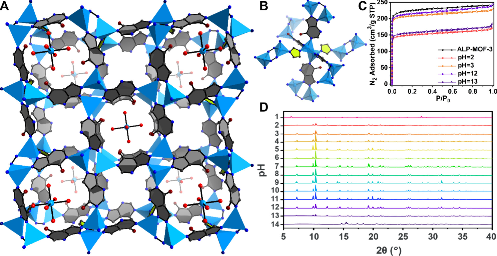 1. 成功开发出新型锌 - 别嘌呤醇 - 咪唑金属有机框架 ALP-MOF-3,该材料兼具优异的热稳定性、化学稳定性和耐氨腐蚀性,BET 比表面积达 680 m²・g⁻¹,在 pH 3~12 范围内能保持结构完整。