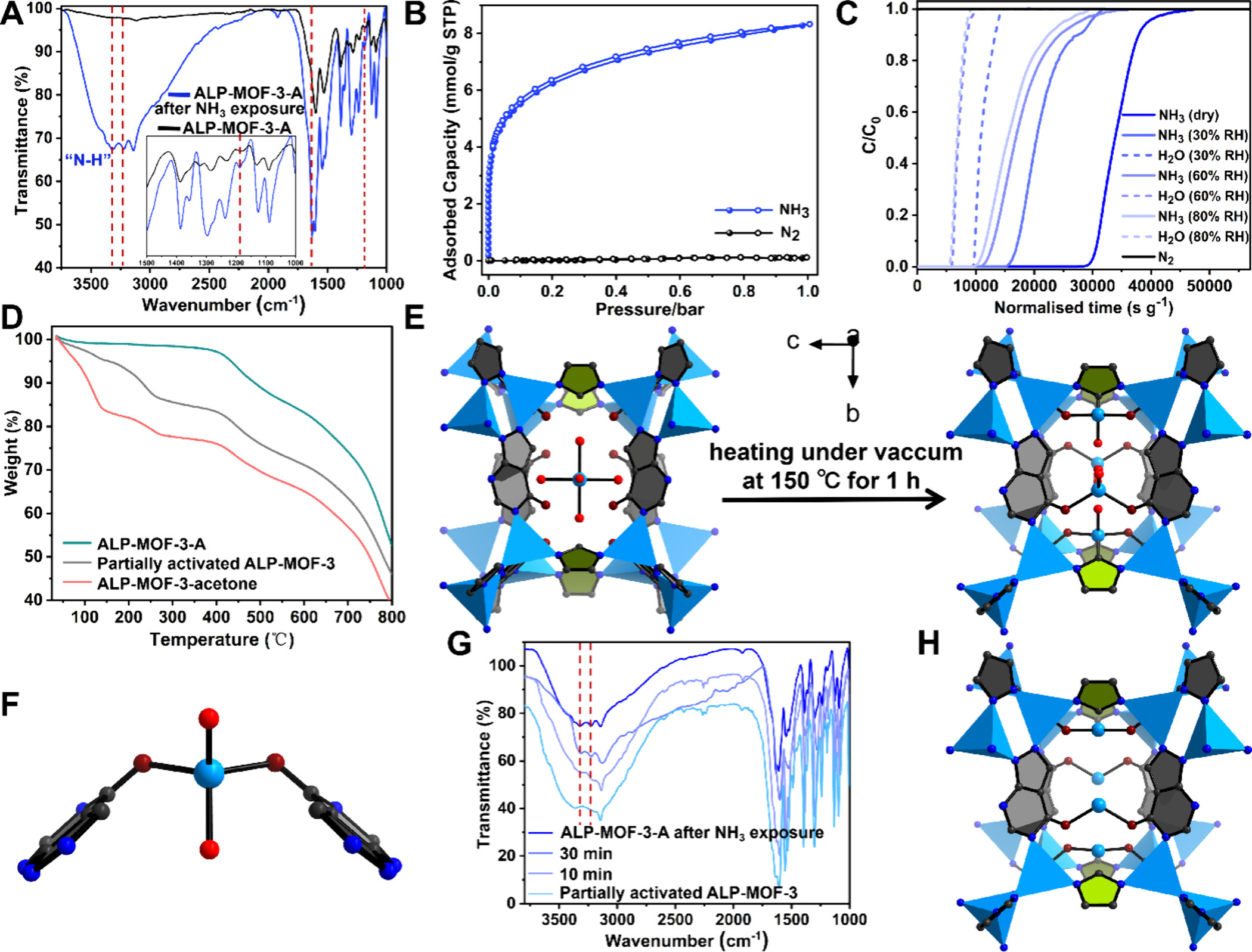 材料经丙酮交换和高温真空活化后,脱除客体溶剂和配位水分子,水合 Zn (II) 八面体发生构型转变,部分 Zn (II) 脱离原配位环境形成开放位点;别嘌呤醇配体的嘧啶氮和羰基氧暴露于孔道,共同构成氨捕获活性位点,且材料在 ab 平面垂直方向保留开放孔道,为氨扩散提供通道。
