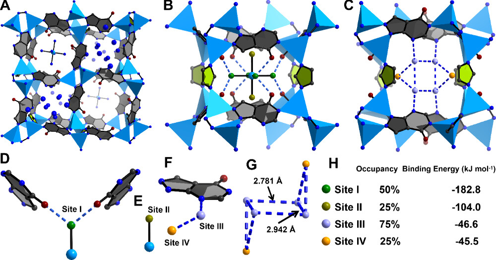 将 ALP-MOF-3-A 装入毛细管气体处理池,298 K、1 bar 下逐步通氨,通过原位同步辐射 SCXRD 解析氨吸附位点,首次识别出 4 个结晶学有序的氨吸附位点,为协同捕获机理提供了直接晶体结构证据。