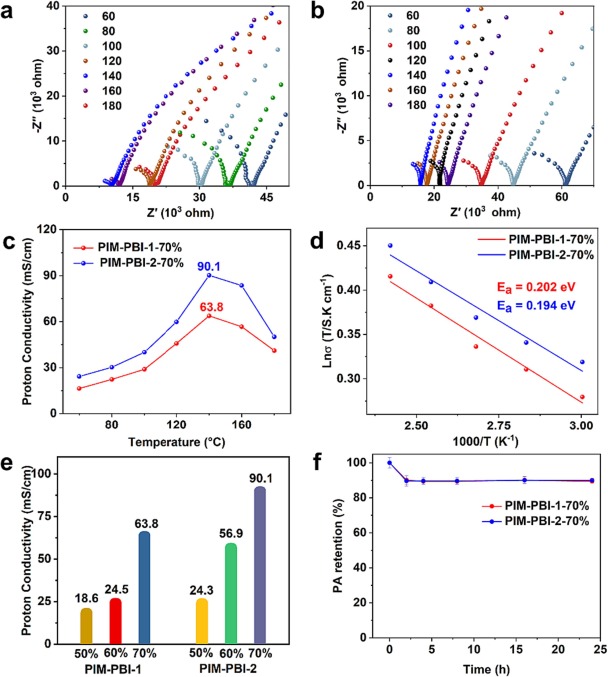 (2)随温度升高,膜的质子导电率明显提高;PIM-PBI-2-70%膜在140°C下质子导电率高达90.11 mS/cm。