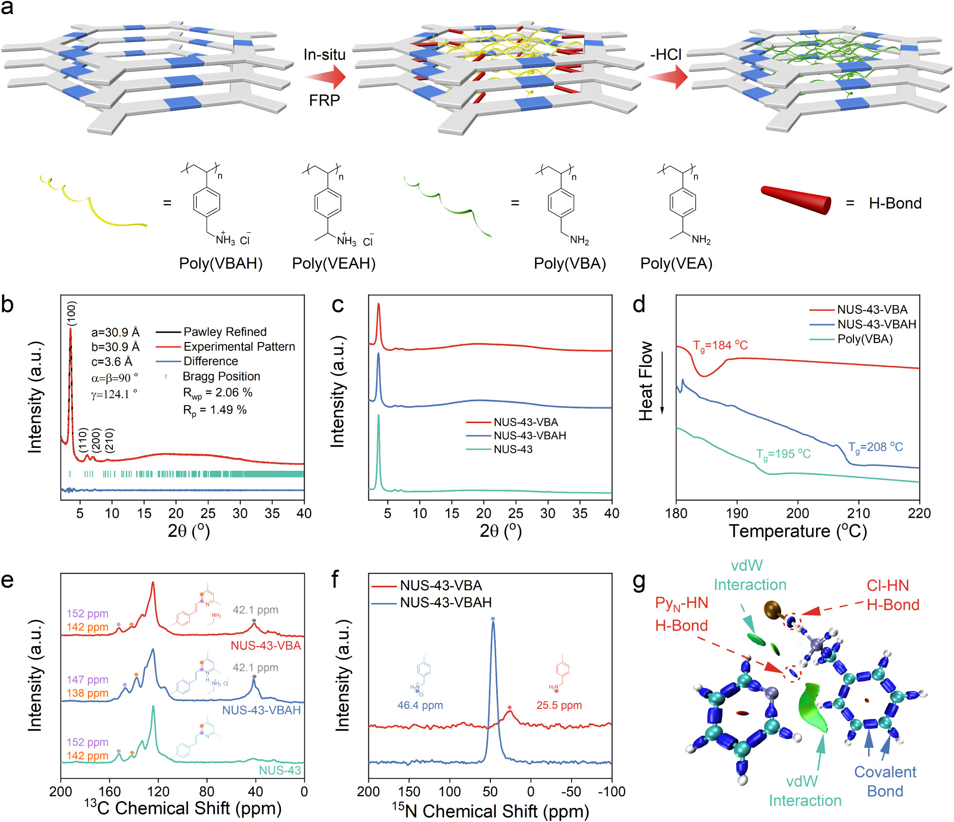 1. 本研究提出氢键桥策略,实现聚胺在NUS-43中原位缠结,解决二维COFs后修饰结晶度丧失难题;