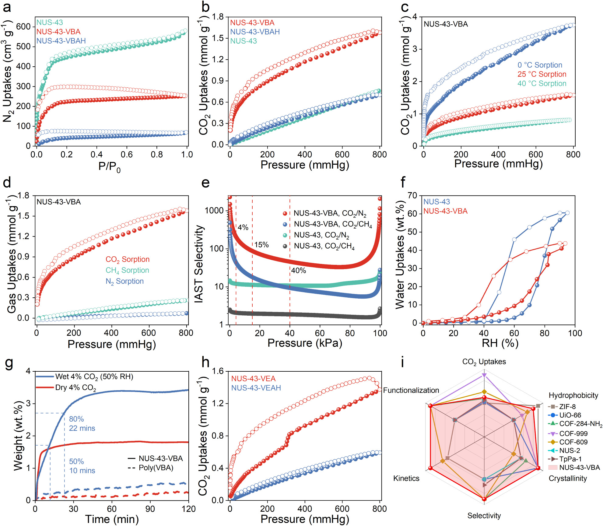 2. 引入苄氨功能化的COF材料NUS-43在低浓度、潮湿环境下捕集CO2性能优异,明确相关机理,为吸附剂设计提供新范式。
