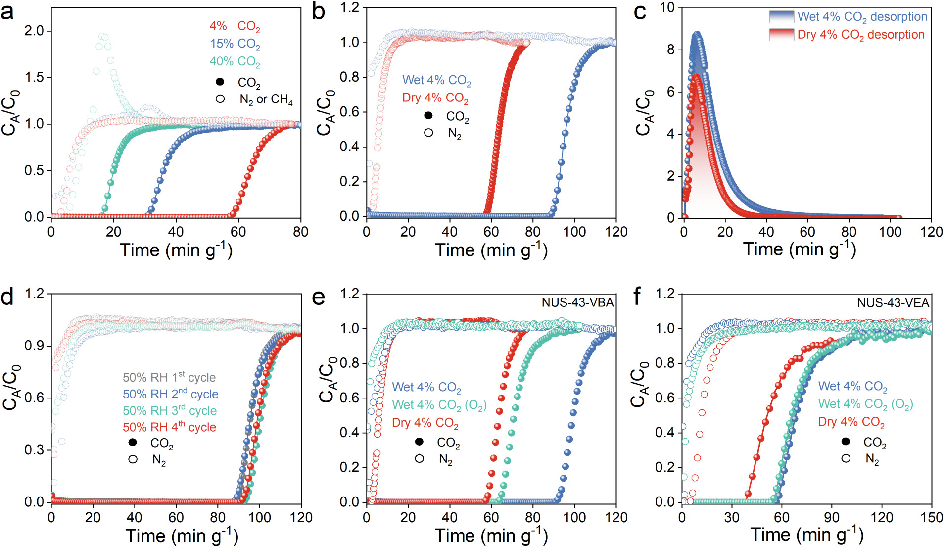 4. DCB实验:25℃下,NUS-43-VBA在4% CO₂、50% RH条件下洗脱时间88.5 min g⁻¹,动态吸附量0.6 mmol g⁻¹,循环4次性能无衰减;VEA衍生物氧化稳定性显著优于VBA衍生物。