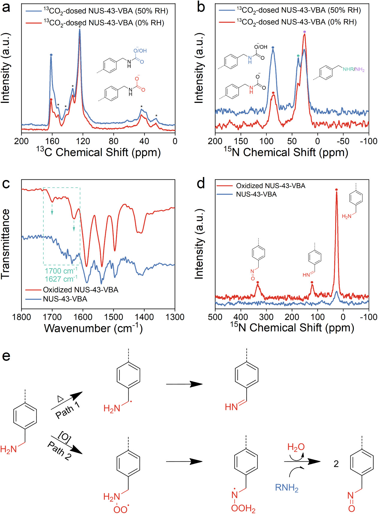 5. 机理验证:通过ssNMR、FTIR明确CO₂吸附产物为氨基甲酸酯和碳酸氢盐;通过多种表征确定胺氧化产物为亚胺和亚硝基化合物。