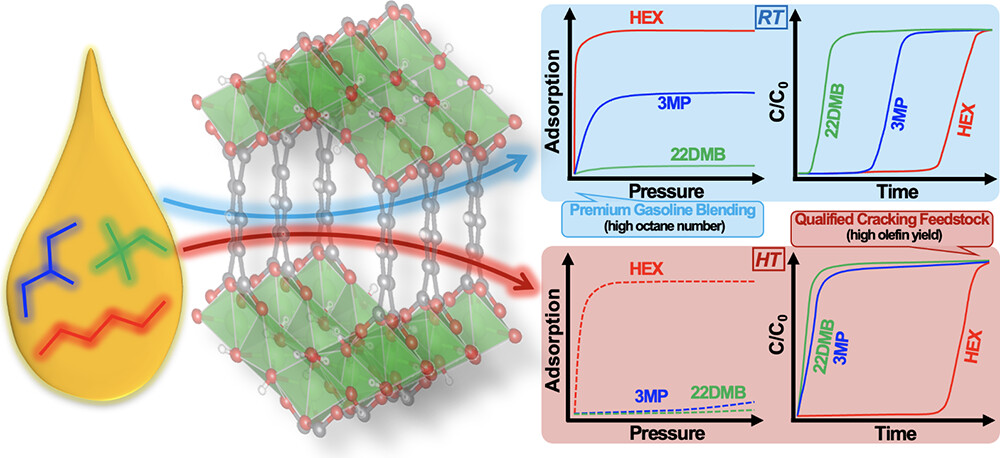 Rutgers大学的李静和深职大的王浩团队的研究中(ACS Materials Lett. 2026 DOI: 10.1021/acsmaterialslett.6c00119)针对石油化工己烷异构体分离难题,报道了刚性铝均苯四甲酸酯基金属有机框架(MIL-120)的变温吸附分离方法。MIL-120孔径约5.5 Å,30℃选择性吸附直链和单支链己烷、排除双支链异构体;120℃仅保留直链己烷。通过穿透实验验证其性能,结合吸附热分析和从头算计算阐明分离机理。