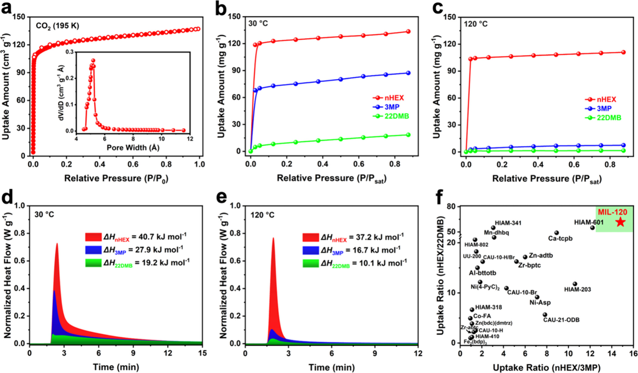 2. 吸附性能测试:30℃和120℃下开展三种己烷异构体单组分吸附实验,195K CO₂吸附评估多孔性,TGA-DSC测定吸附焓。结果:30℃时nHEX、3MP吸附容量分别为135、87 mg g⁻¹,22DMB吸附量极低;120℃时nHEX吸附容量111 mg g⁻¹,支链异构体吸附可忽略。