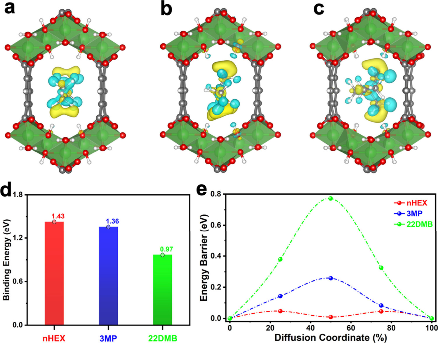 1. 吸附分离机理:热力学上,nHEX与框架作用最强,支链越多作用越弱;动力学上,nHEX扩散壁垒最低(0.05 eV),22DMB最高(0.77 eV),二者协同实现选择性吸附。